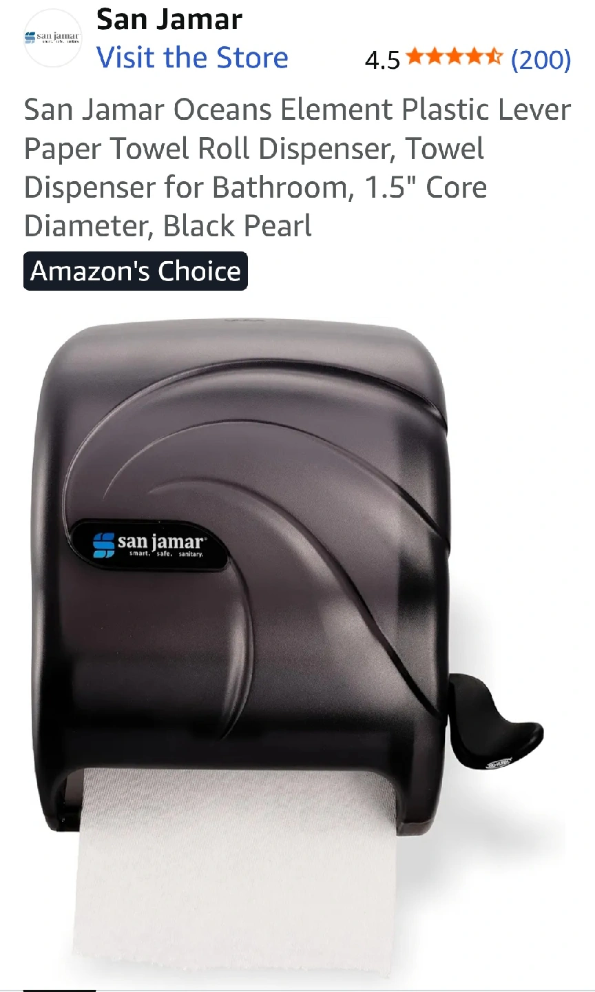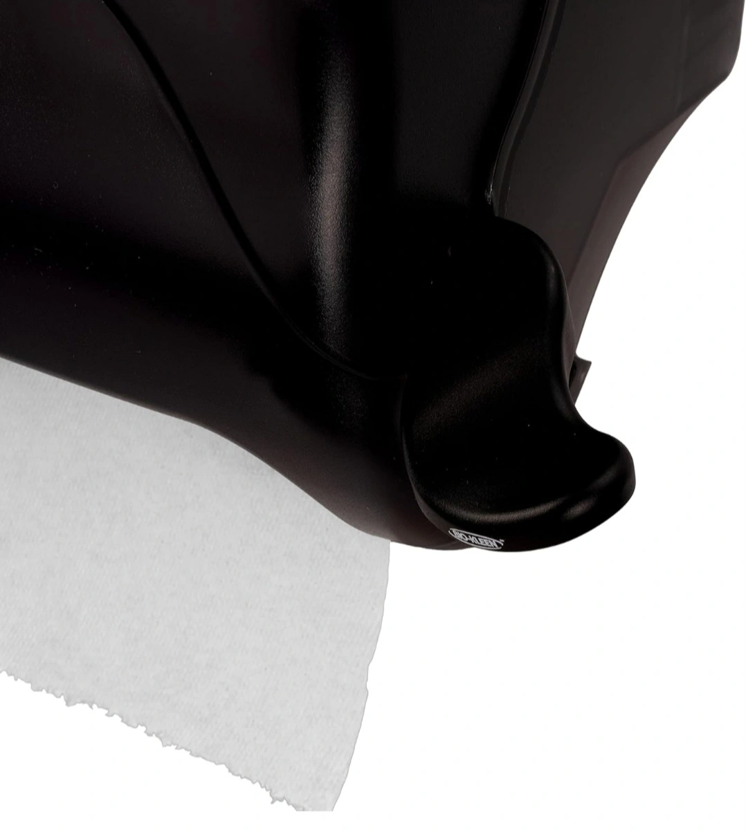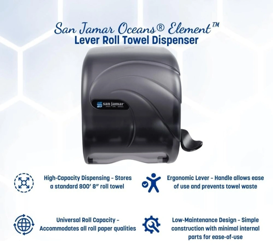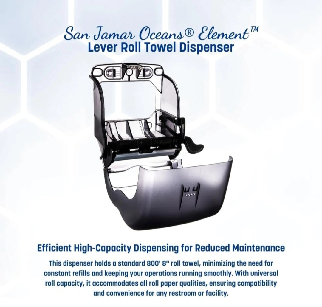 This is a San Jamar Oceans Element Lever Roll Paper Towel dispenser. It's designed for efficient high-capacity dispensing, minimizing the need for constant refills. It accommodates all roll paper qualities, ensuring compatibility and convenience for any Restroom, Kitchen or Facility. The dispenser holds a standard 800' 8" roll towel