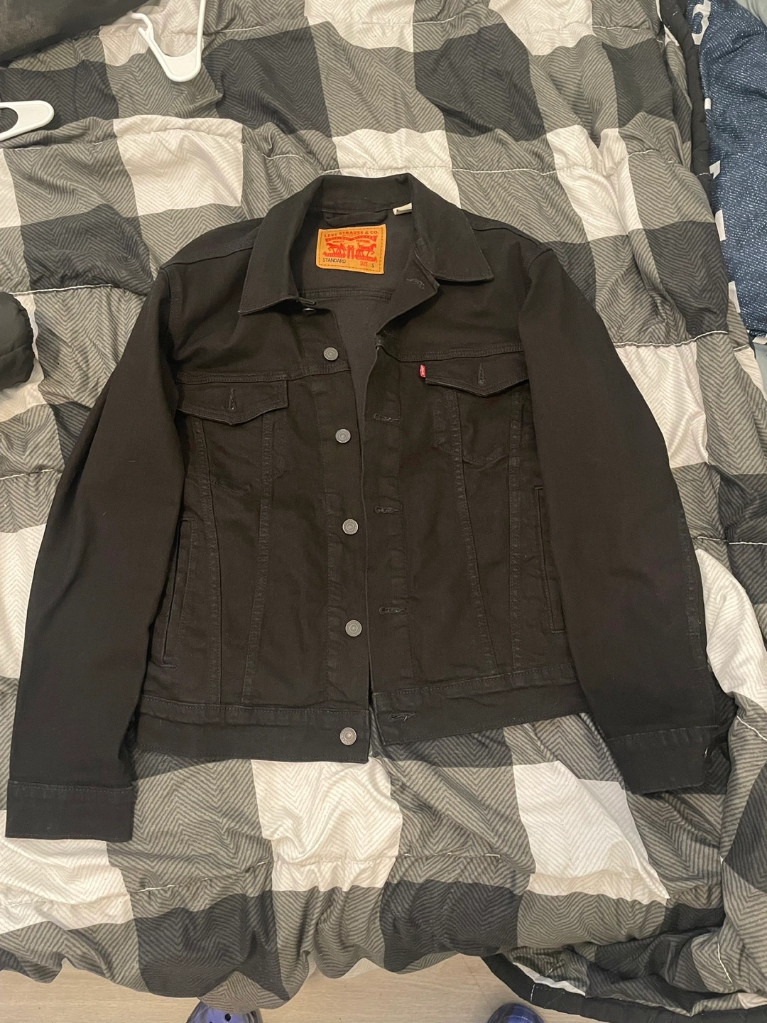 Men's black denim jacket. Classic style. Long sleeves. Button closure. Pockets. Price is firm