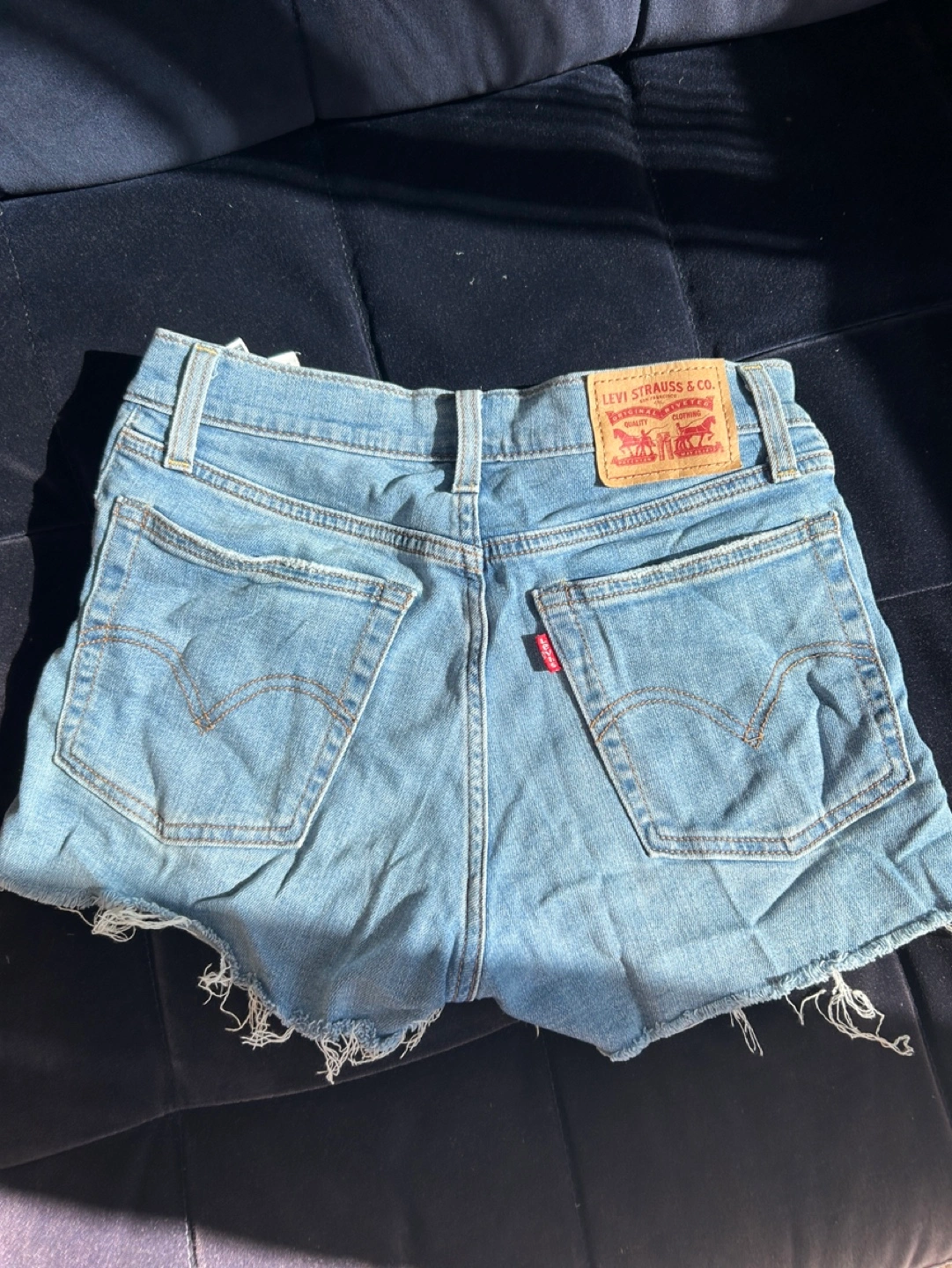 Cute Levi's denim shorts in a size 26! They're made of 92% cotton, making them super comfy for everyday wear. The shorts have a classic denim look with a bit of a distressed style.