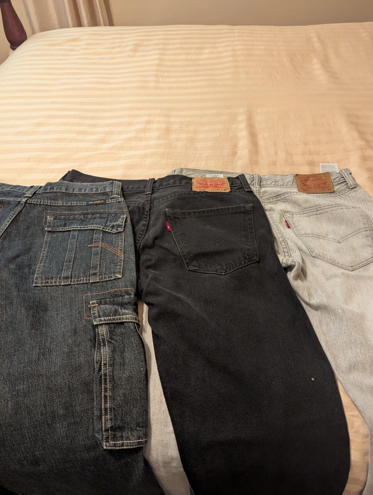 Selling a bundle of three Levi's jeans! Included are a pair of cargo jeans, a black pair, and a light grey pair. All are size 32x30. Great for someone looking to expand their wardrobe! Total for all 3 pairs 30.00