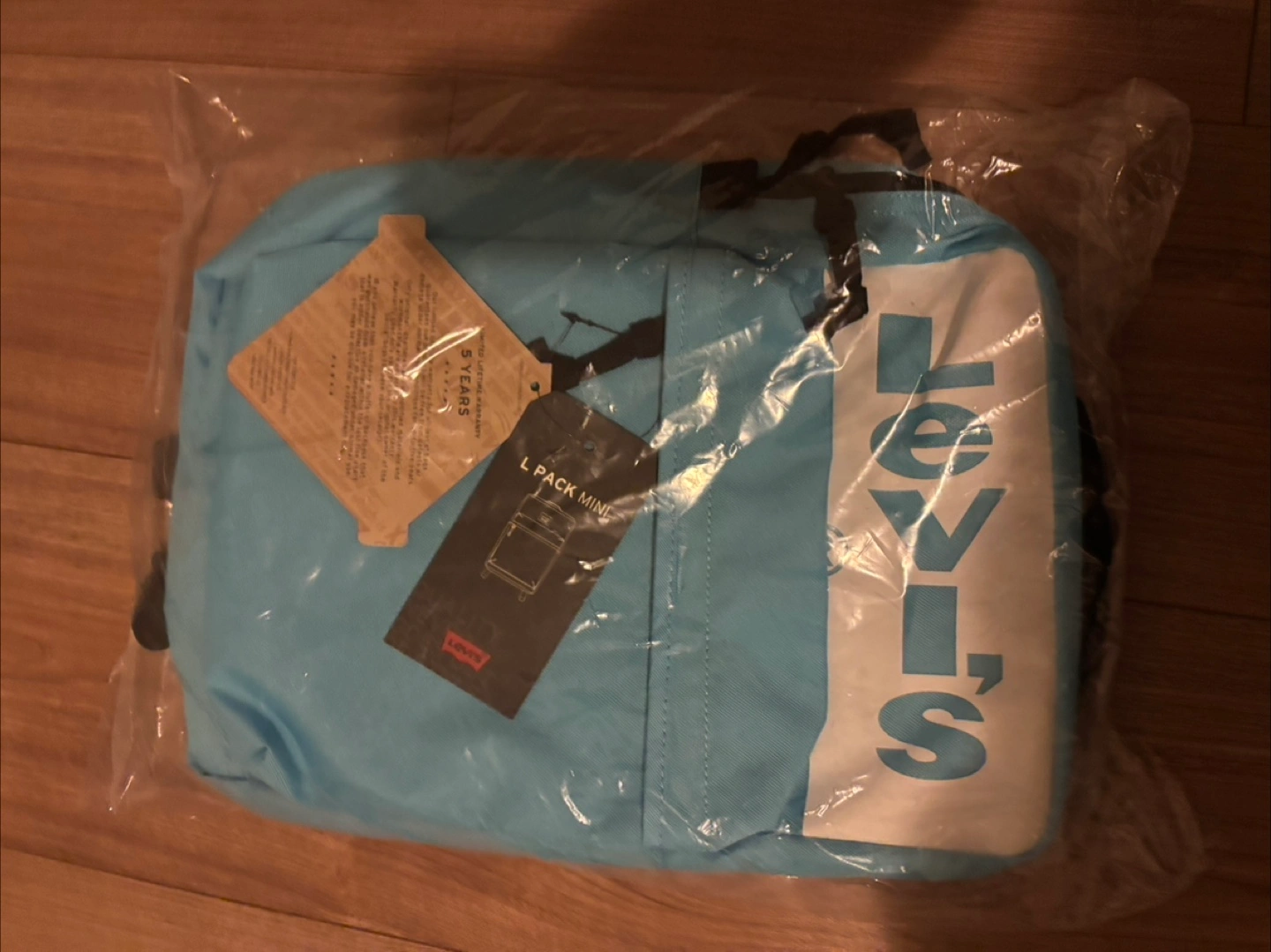 Here's a Levi's L Pack Mini sling bag in a lovely shade of blue! It's still in its original packaging, so it's in new condition. Perfect for carrying your essentials while keeping your hands free. It's a stylish and practical accessory!