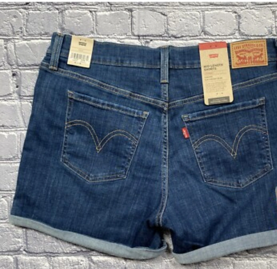 Selling a brand new pair of Levi's mid-length denim shorts in size 26. These are a classic wardrobe staple, perfect for warmer weather! The dark wash denim is versatile and easy to style. They feature the iconic Levi's logo on the back pocket. These shorts are new with tags!