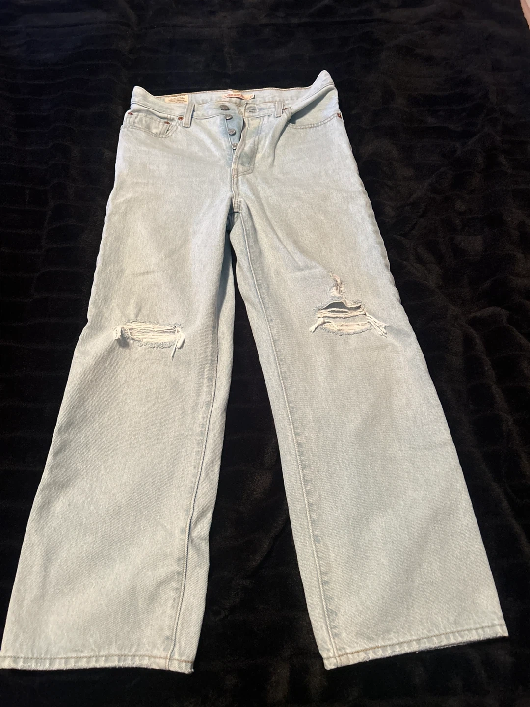 Selling a pair of Levi's Ribcage Straight Ankle jeans in size 27. They're a light wash denim with a button-fly closure. There are some distressed details on the knees, giving them a stylish, worn-in look!