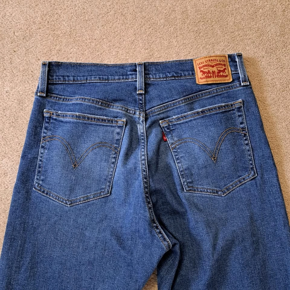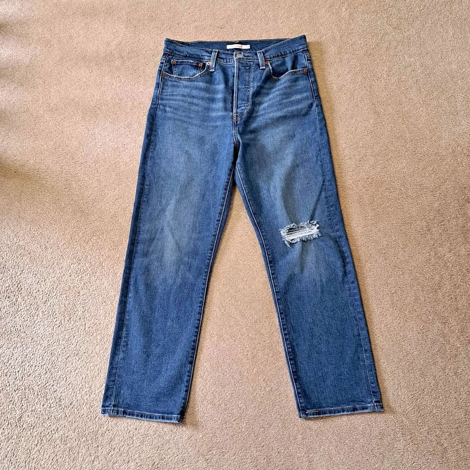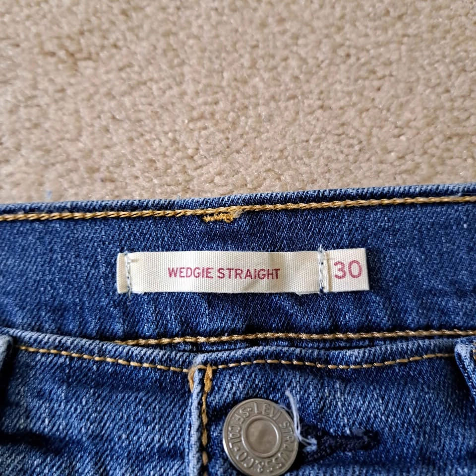Excellent condition Levi's Wedgie jeans. High rise, straight leg with button fly closure and 5 pocket style. Mid wash blue denim with distressing at one knee. Size: 30 Colour: blue Approximate measurements laid flat: Waist across: 15.5" Rise: 12" Inseam: 28" Pick up in Breslau. Smoke-free, pet free home.