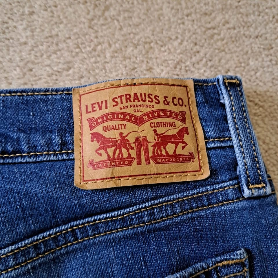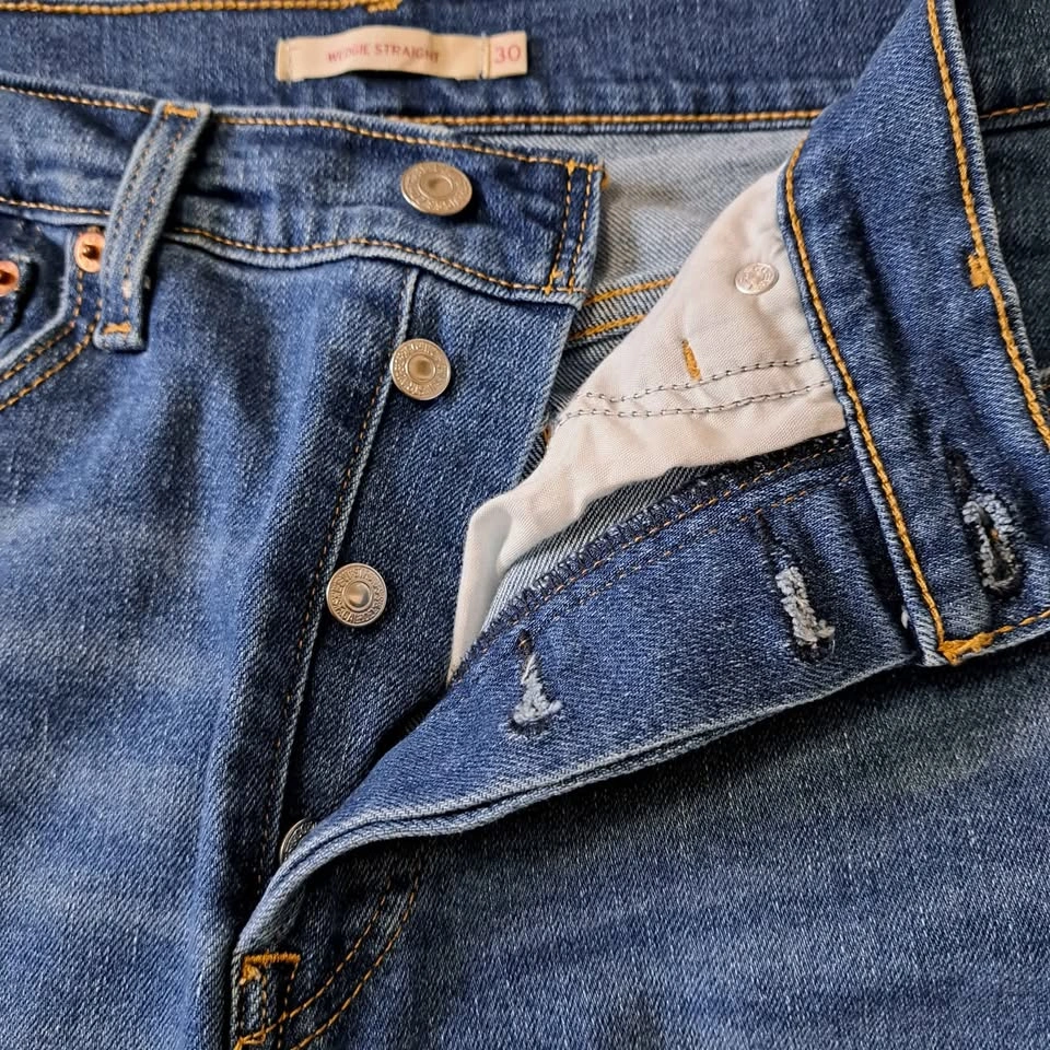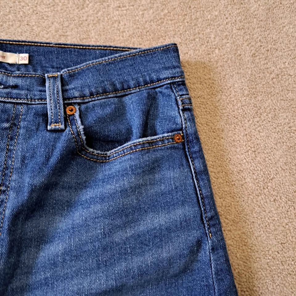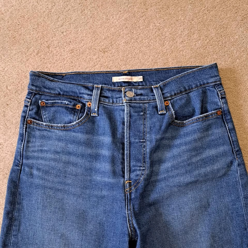 Excellent condition Levi's Wedgie jeans. High rise, straight leg with button fly closure and 5 pocket style. Mid wash blue denim with distressing at one knee. Size: 30 Colour: blue Approximate measurements laid flat: Waist across: 15.5" Rise: 12" Inseam: 28" Pick up in Breslau. Smoke-free, pet free home.