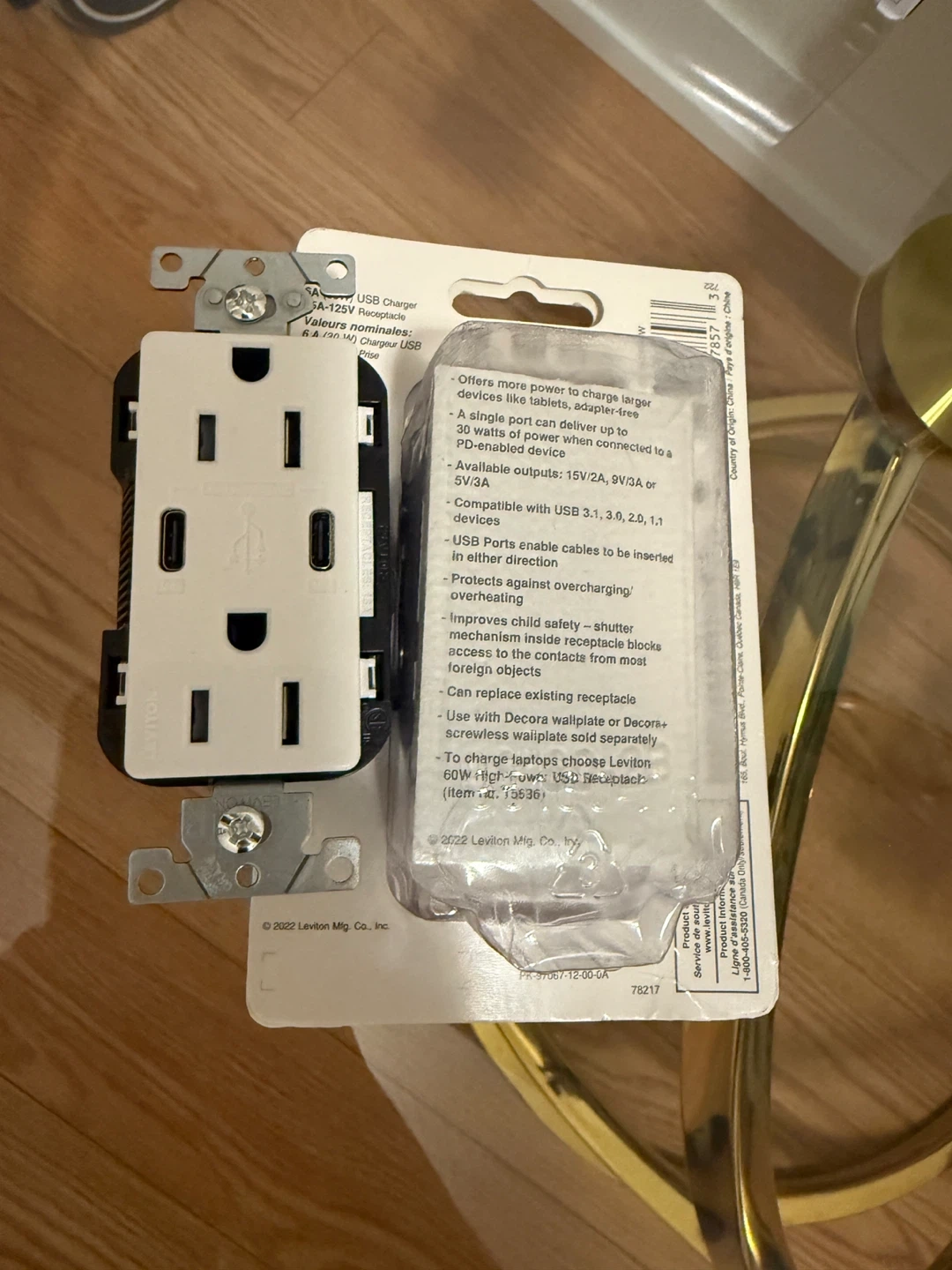 Offering a Leviton USB charger receptacle. It offers more power to charge larger devices like tablets, adapter-free. A single port can deliver up to 30 watts of power when connected to a PD-enabled device. It's compatible with USB 3.1, 3.0, 2.0, 1.1 devices. USB ports enable cables to be inserted in either direction. It also protects against overcharging/overheating