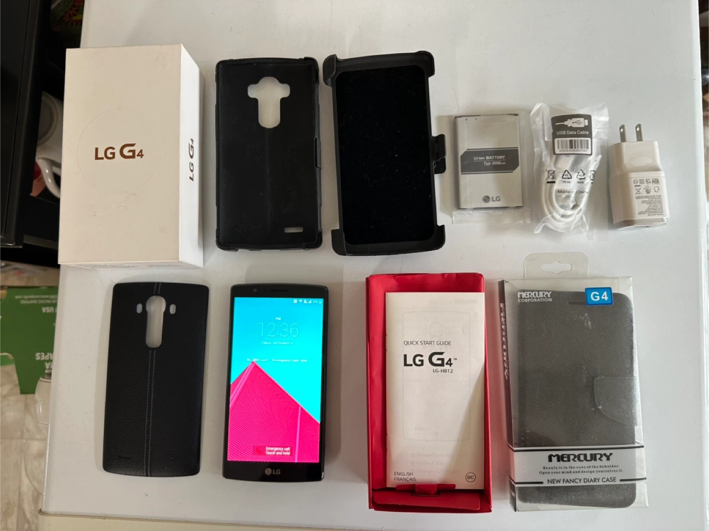 Selling an LG G4 smartphone. It comes with the original box and a variety of accessories. Including items in unused condition: a charger, USB data cable, Li-ion battery, and a quick start guide. Also included are a few cases, ie a new Mercury New Fancy Diary case. Phone is unlocked and working condition LG is well-known for its good camera!