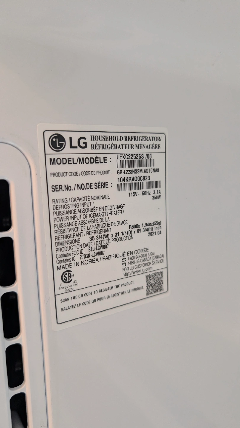 Selling an LG household refrigerator, model LFXC22526S/08. It's in great condition and ready to keep your food fresh! The model number is LFXC22526S /08. Manufactured on 2021. purchased via Costco. compare new at $2500+. open to reasonable offers. lowball offers will be ignored. 10 year compressor warranty dual ice Makers and water filter https://products.caplans.ca/products/view/22-cu-ft-WiFi-Enabled-Counter-Depth-French-Door-Refrigerator---LFXC22526S