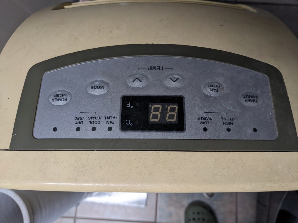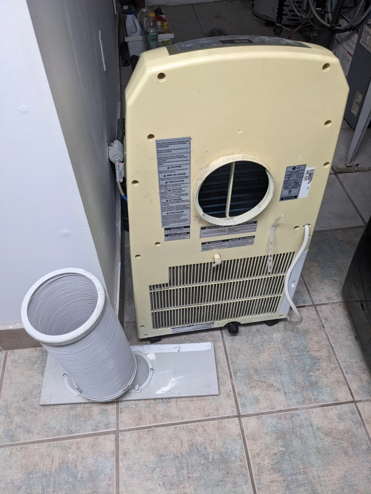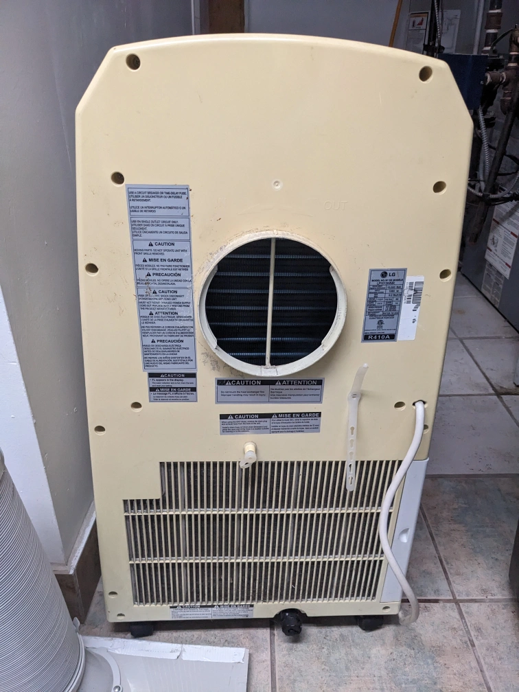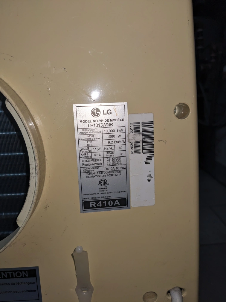 Selling an LG portable air conditioner, model LP1013WNR. It has a cooling capacity of 10,000 BTU/h and an input of 1080 W. It uses R410A refrigerant. Perfect for keeping cool during those hot summer days! comes with remote. a bit discoloured due to sitting idle in the basement.
