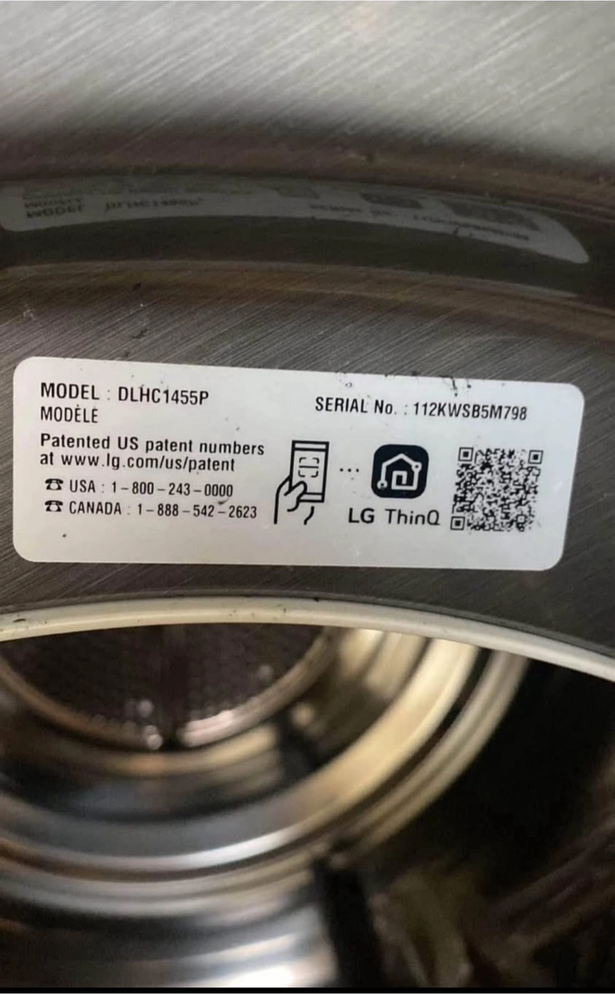 Selling an LG ThinQ Dryer, model number DLHC1455P. It's in great condition and ready to help with your laundry needs! LG dryer, It features . capacity to hold large and bulky loads while the Speed Dry cycle thoroughly dries your small loads in as little as 25 minutes. It's equipped with AI Sensor Dry intelligence to automatically adjust drying times so you never have to worry about your clothes being damp or overdried.