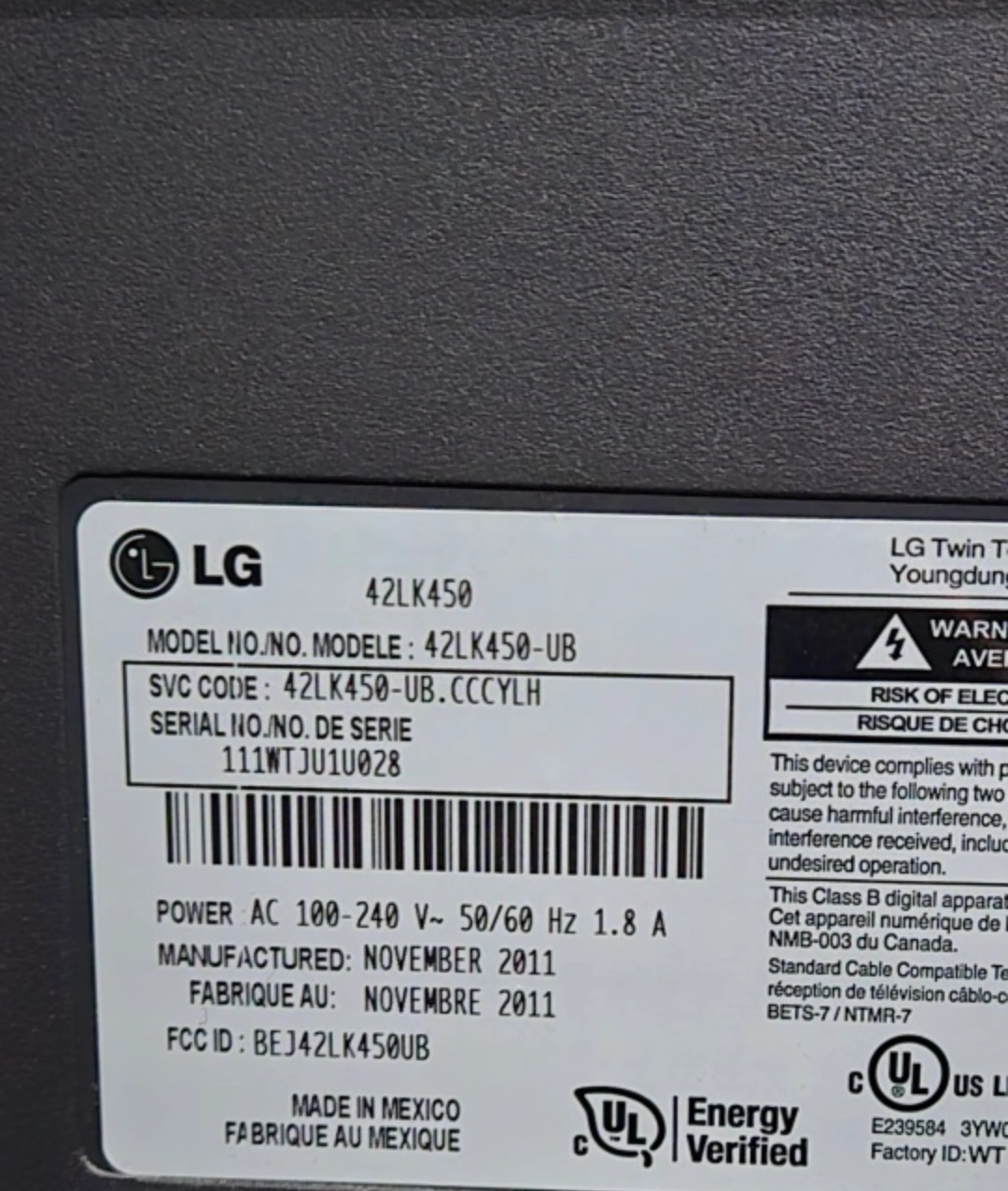 42-inch LG LCD HDTV. Model number 42LK450-UB. Includes remote. Manufactured November 2011. Good condition. Great for a bedroom or smaller space.