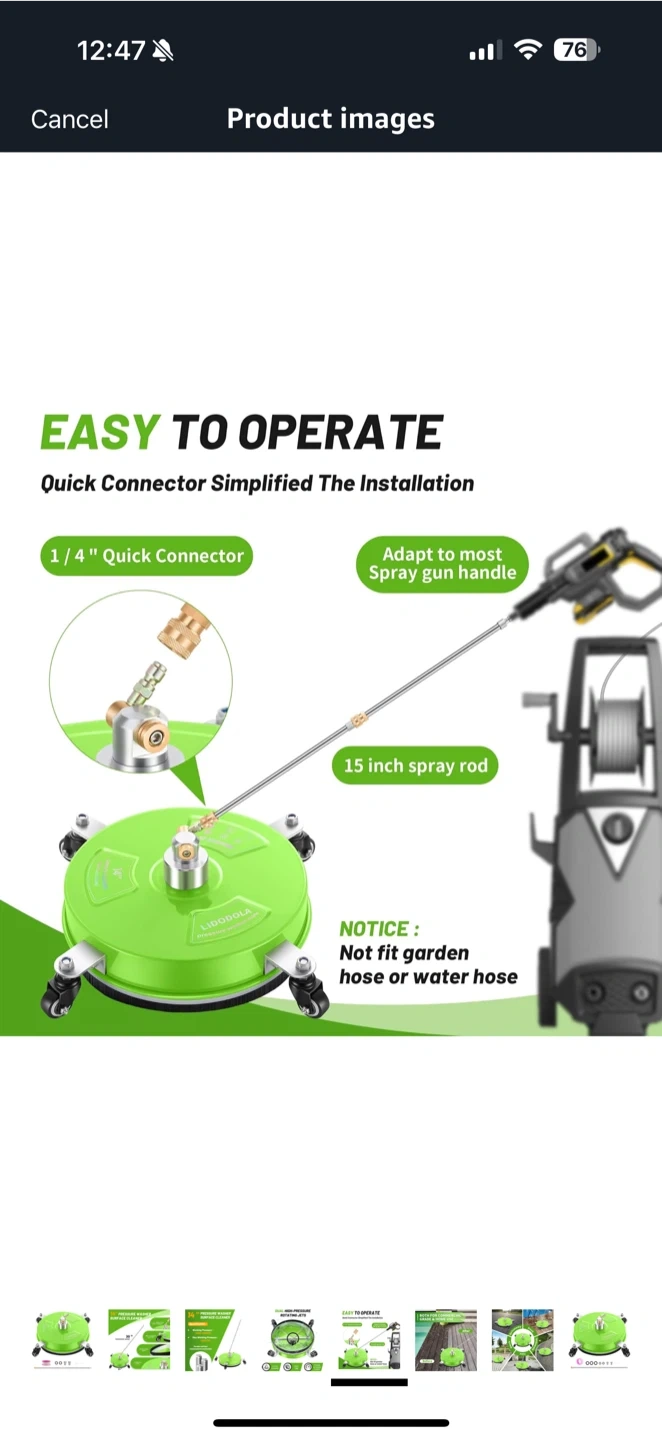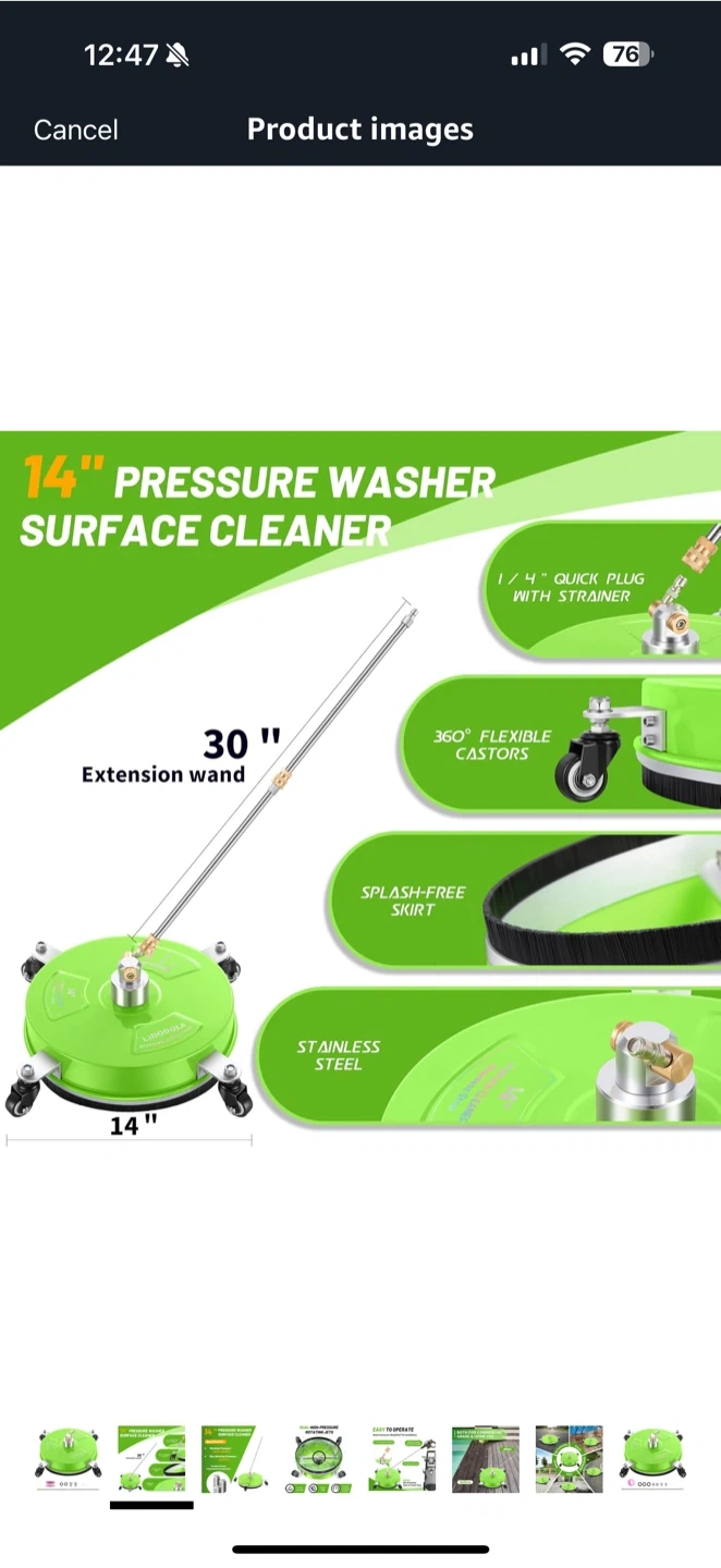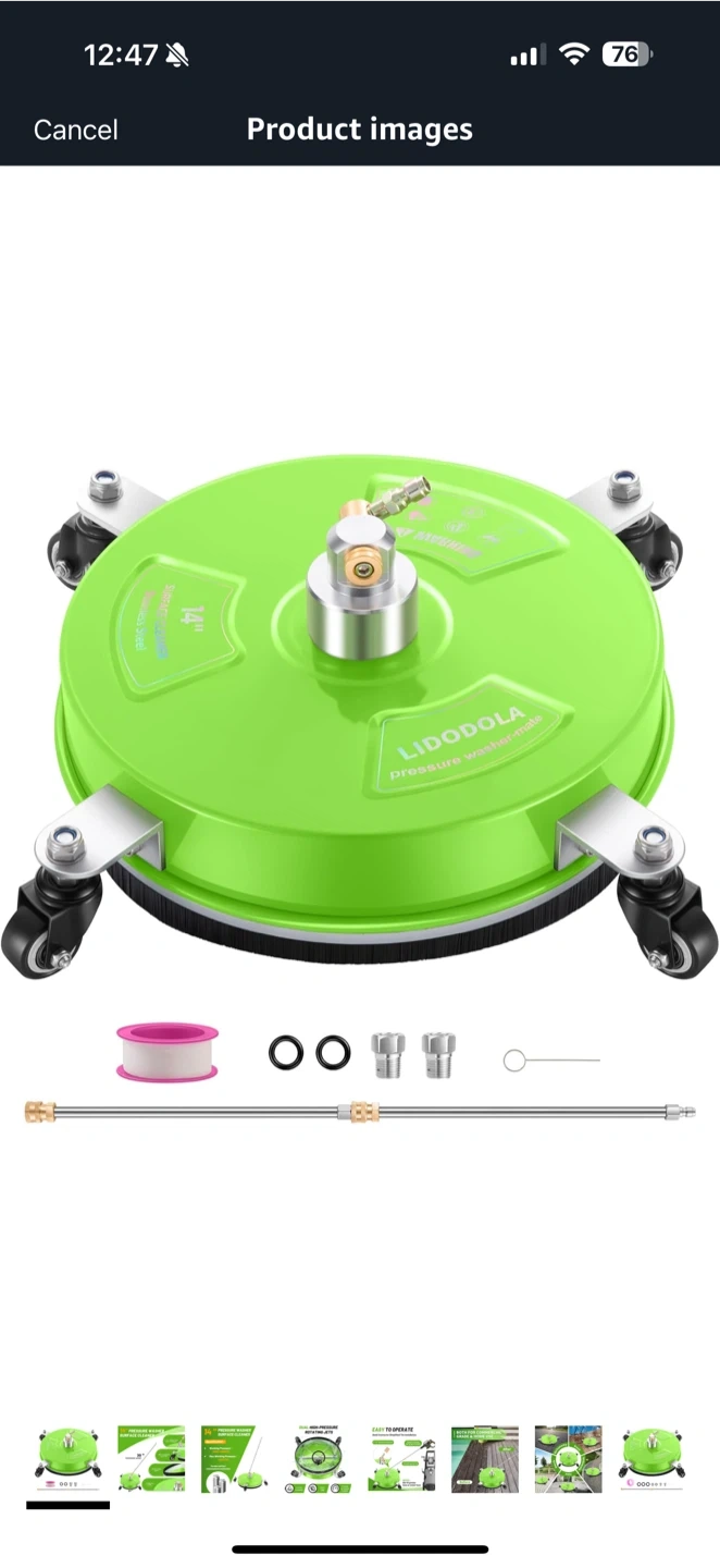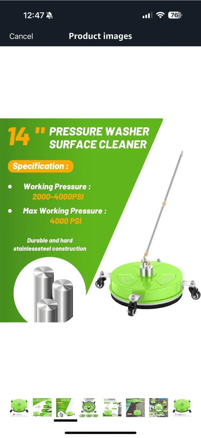Get your outdoor cleaning done quickly with this LIDODOLA 14" pressure washer surface cleaner! It features: - A 1/4" quick connector for simplified installation - Durable stainless steel construction - A 15-inch spray rod - Max working pressure of 4000 PSI Perfect for cleaning patios, driveways, and more!