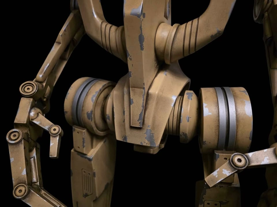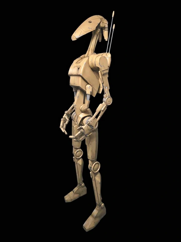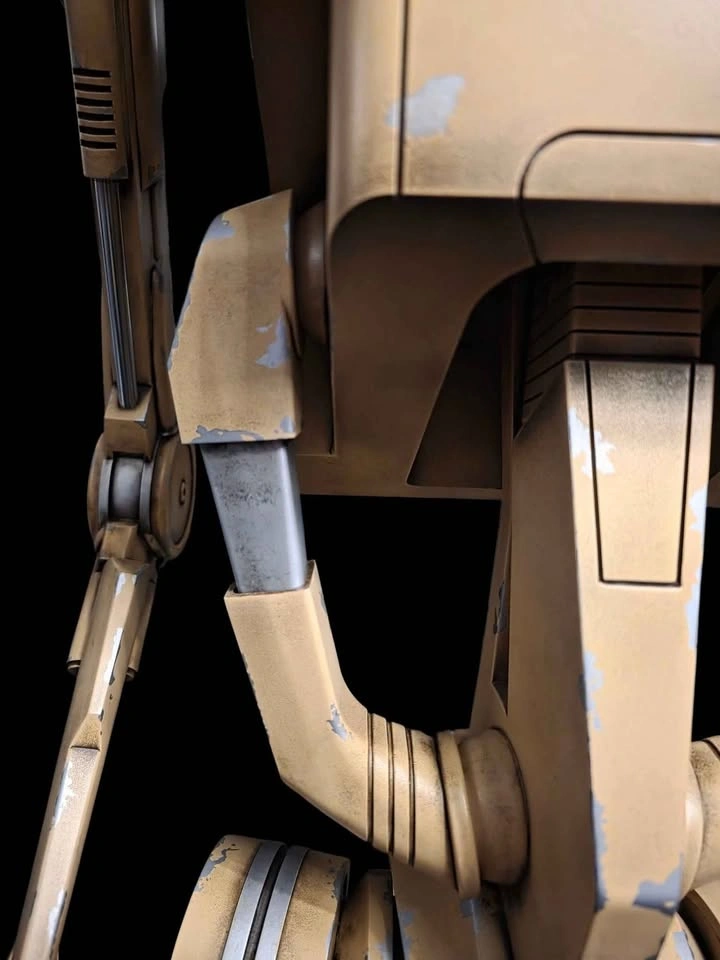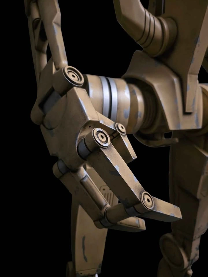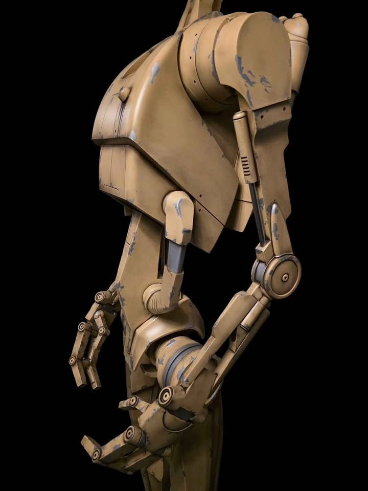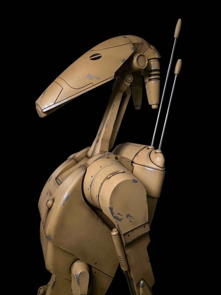 B1 Battle Droid (Episode 1) life size at about 7' tall, made by myself from PETG plastic, steel and resin. Made nearly solid with internal steel rods for structural support, it is fully articulated (head, neck, shoulders, elbows, wrists, all fingers, torso, hip) backpack is removable and empty to leave room for electronics. All paint chipping on the droid is real, it is painted with a 5 step process and then hand weathered after. Hip attachments are affixed magnetically and will rotate with the droid, the head and torso easily come off for easier transport. Real hardware is used for the entire build, steel hex screws and threaded inserts, as well as neodymium magnets, no screws into plastic. Base is solid resin and painted with automotive paint and sealer, it is extremely heavy/sturdy and on casters for easy moving.. earthquake proof. Solid steel rods are used for pistons and antennas and the whole thing feels very very heavy, solid and well made, roughly 1000 hours of work went into this project and over 500 dollars of paint just for the droid. I will also include a pair of non functioning Battle Droid binoculars with real lenses (the droid is fully capable of holding them, message for more pictures if interested). This would make an amazing display piece for a living room or theatre room, feels like it jumped right out of the screen!