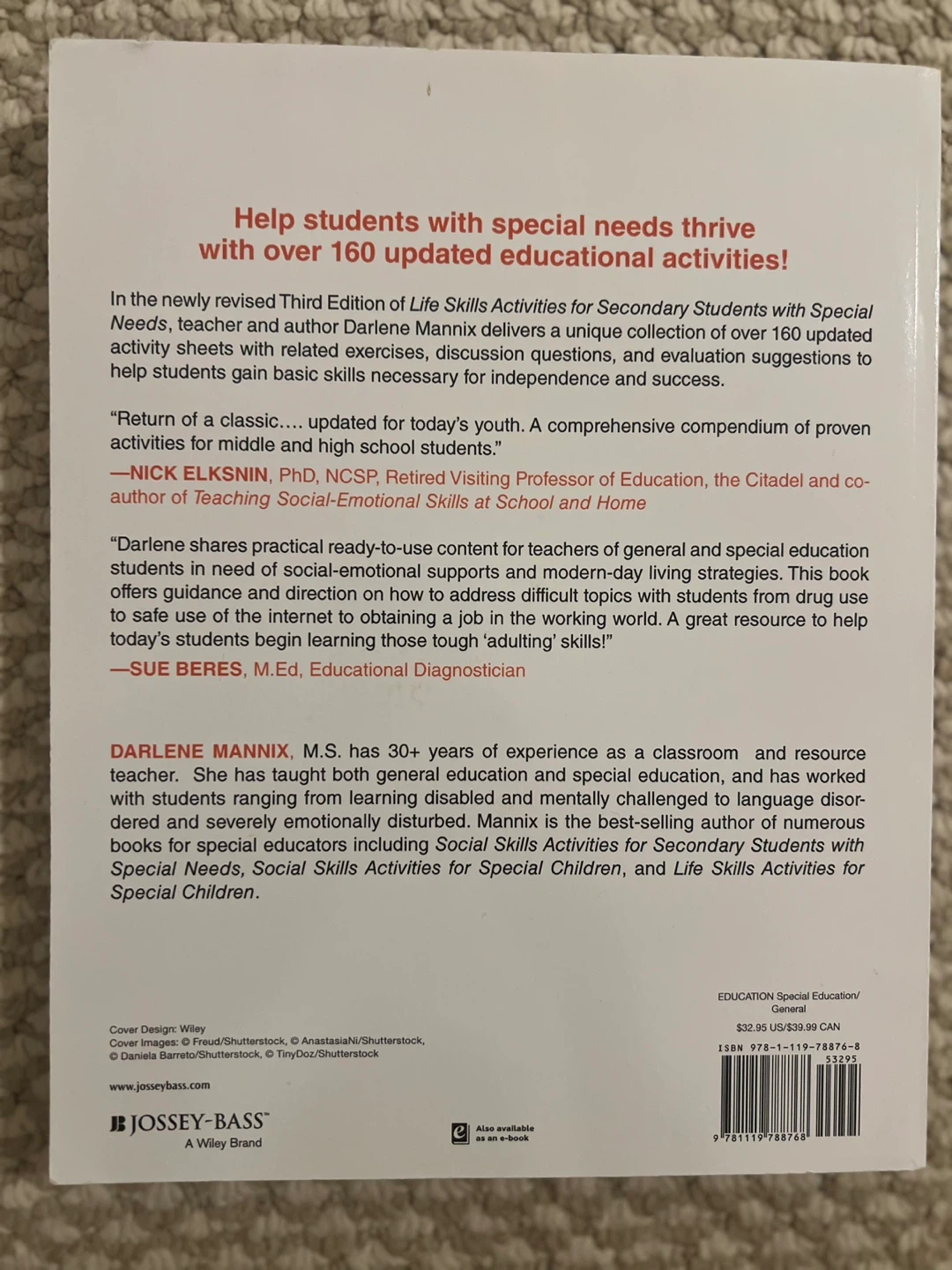 Selling a copy of "Life Skills Activities for Secondary Students with Special Needs" by Darlene Mannix! This is the third edition and a great resource for educators or anyone looking to develop essential life skills. It has over 160 updated educational activities! Perfect for special education or general life skills development
