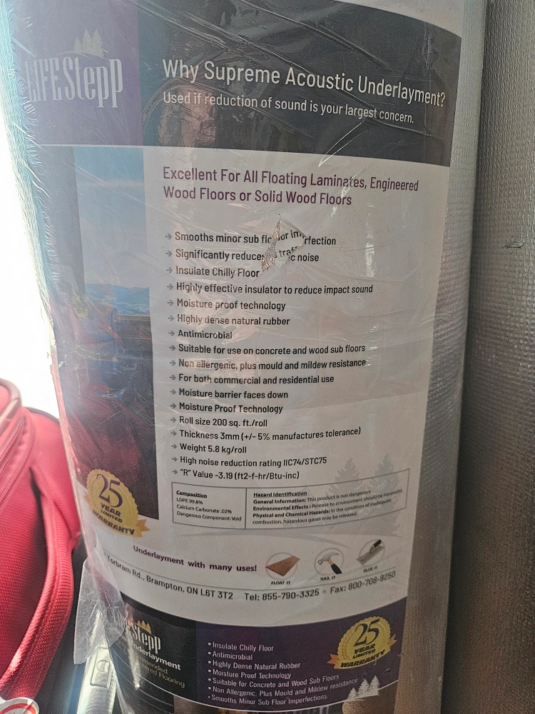 Selling new rolls of LifeStepp Supreme Acoustic Underlayment. Great for reducing sound under floating laminates, engineered wood floors, or solid wood floors. Key features: - Smooths minor subfloor imperfection - Significantly reduces impact and traffic noise - Insulates chilly floor - Highly effective insulator to reduce impact sound - Moisture-proof technology - Highly dense natural rubber - Antimicrobial - Suitable for concrete and wood subfloors - Non-allergenic, plus mould and mildew resistance - For both commercial and residential use - Roll size 200 sq ft - Thickness 3mm