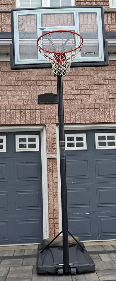 Portable and adjustable. Classic 18in steel rim. All weather nylon net. Heavy duty portable base. Polycarbonate backboard. Quick adjust system for height adjustments to a max of 10 ft. Pickup only