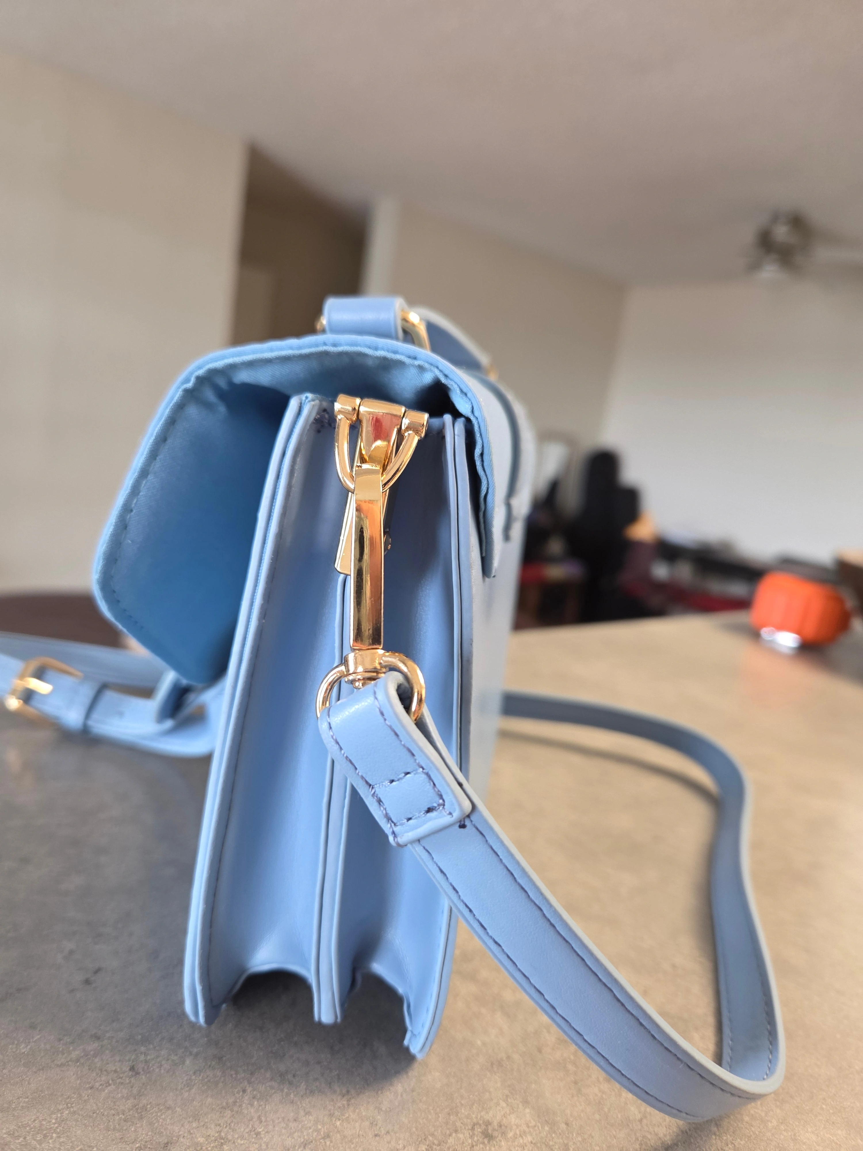 Brand new and never used light blue flap purse with removable strap that is adjustable. You can wear it over the shoulder or cross shoulder as the strap is long enough and adjustable. Made of faux leather and nylon with gold coloured metal accents. Approximate sizing: 15cm (H) x 22cm (L) x 5cm (W).