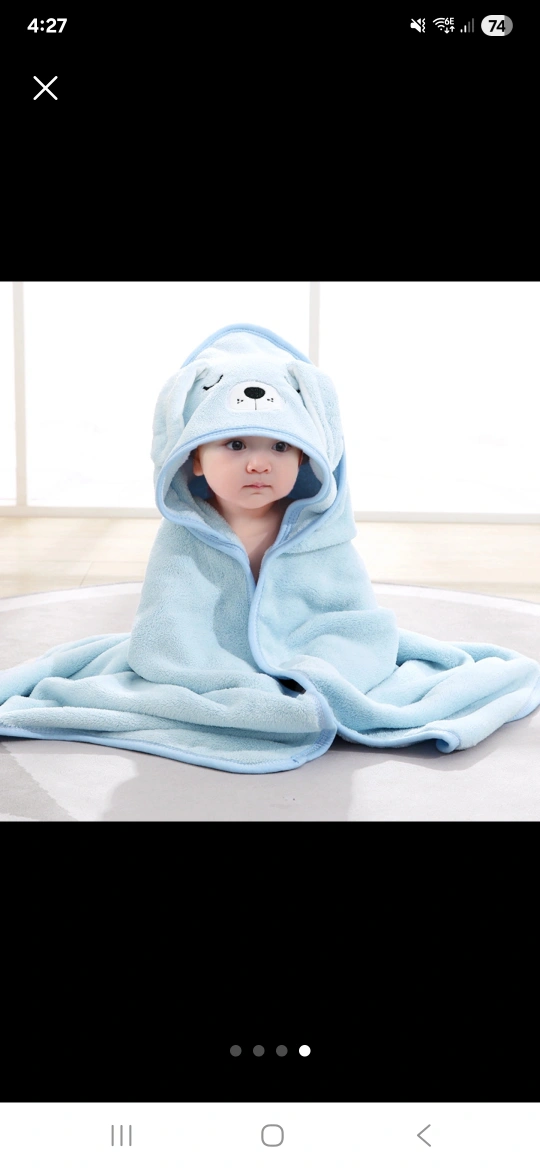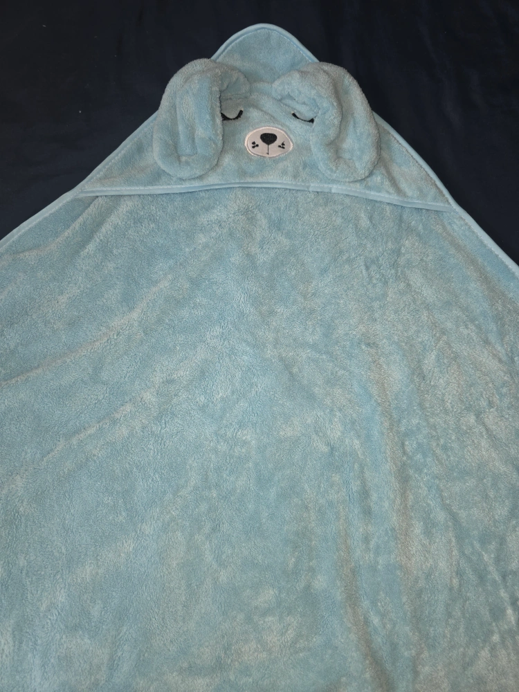 A light blue hooded baby towel featuring a cute sleeping dog design on the hood! It's soft and cozy, perfect for keeping your little one warm after bath time.$10 each both for $15.