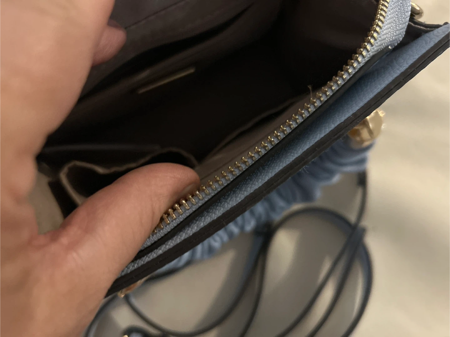 This is a super cute light blue Moda Luxe mini handbag! It comes with a detachable strap, so you can wear it as a crossbody or carry it as a top handle bag. The gold hardware and butterfly details add a touch of elegance to this adorable bag.