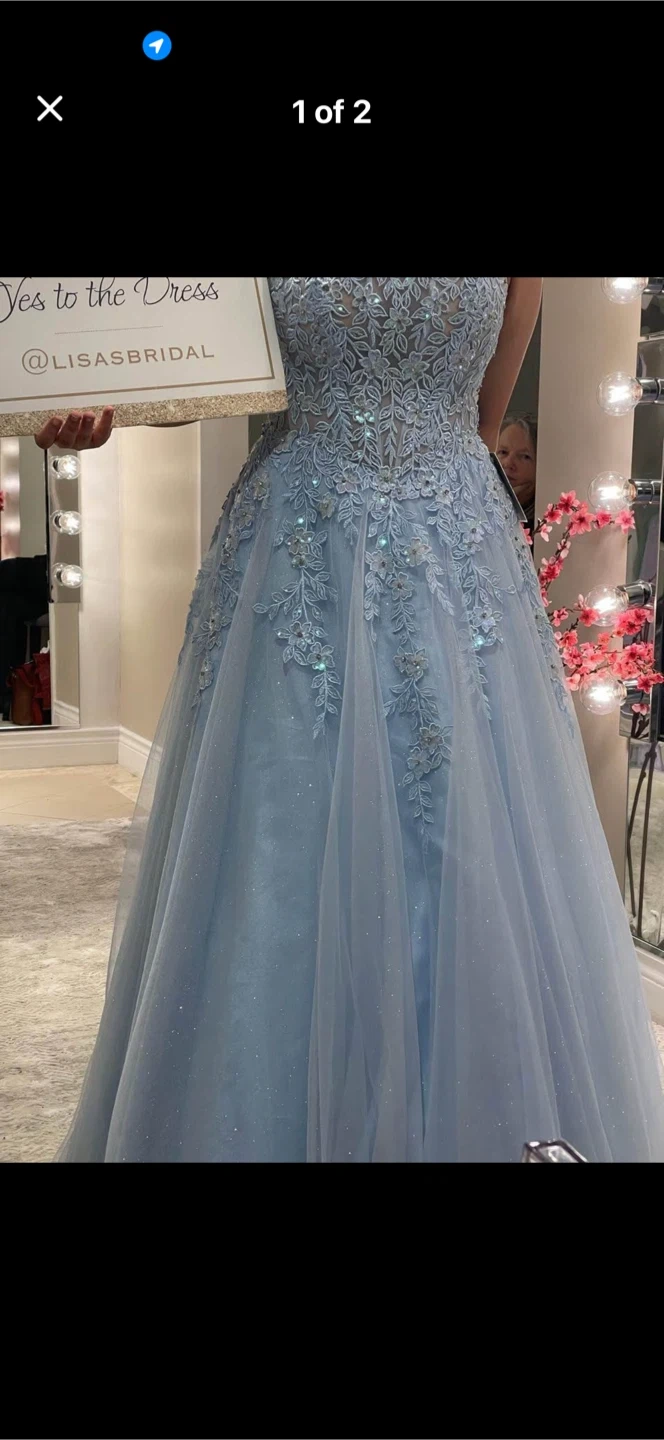 Selling a beautiful light blue prom dress! It features delicate floral detailing and a flowing tulle skirt. Perfect for a special occasion!