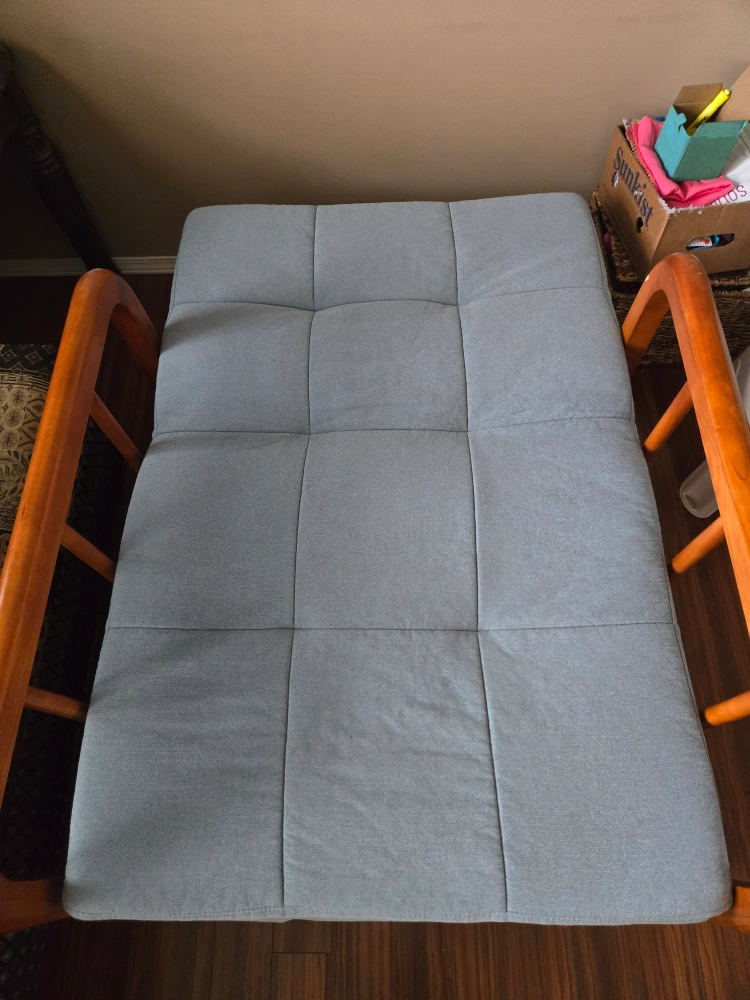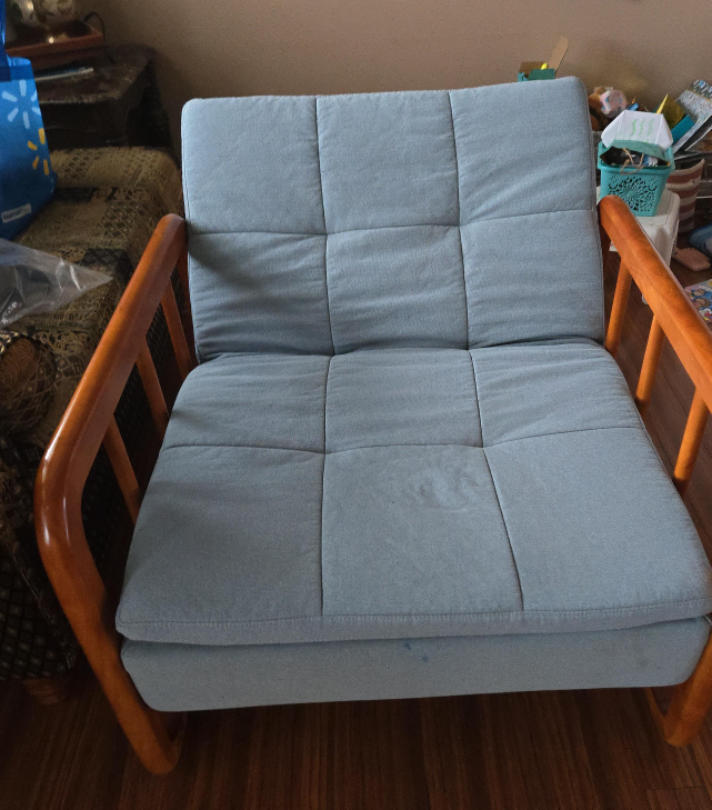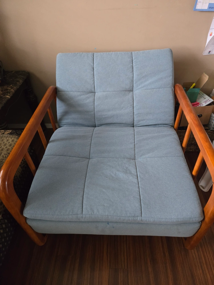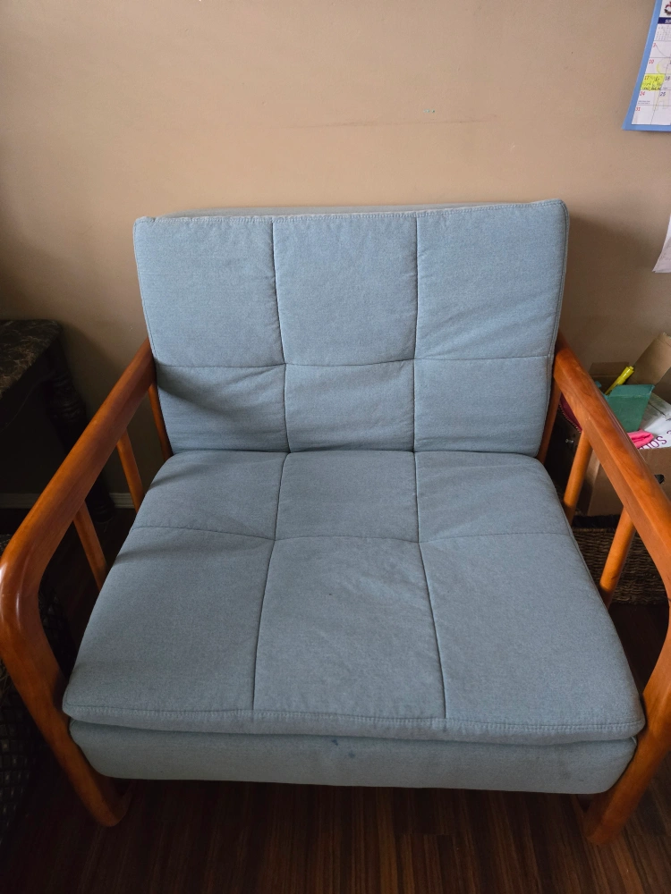 Selling a comfy light blue armchair! It has a nice wooden frame and a cushioned seat and back. It's perfect for relaxing and adding a touch of style to your living room or bedroom