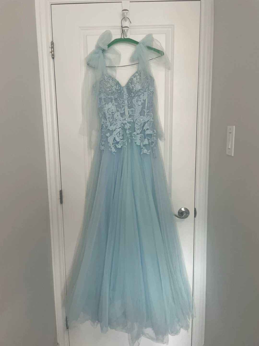 Selling a beautiful light blue tulle formal dress! It's in great condition and perfect for a special occasion. The dress features delicate lace detailing on the bodice and flowing tulle skirt. It has cute bows on the shoulders. Feel free to reach out if you're interested!