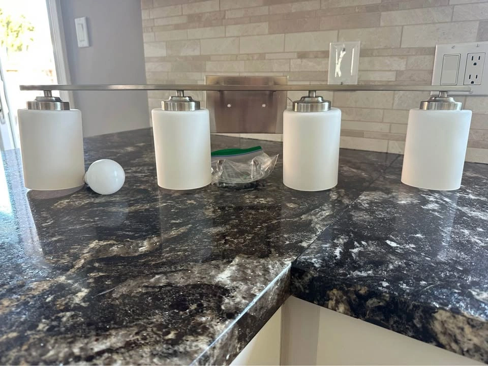 Light fixture with 4 LED bulbs included …. Minor damage on top of silver bar and lighting knobs.