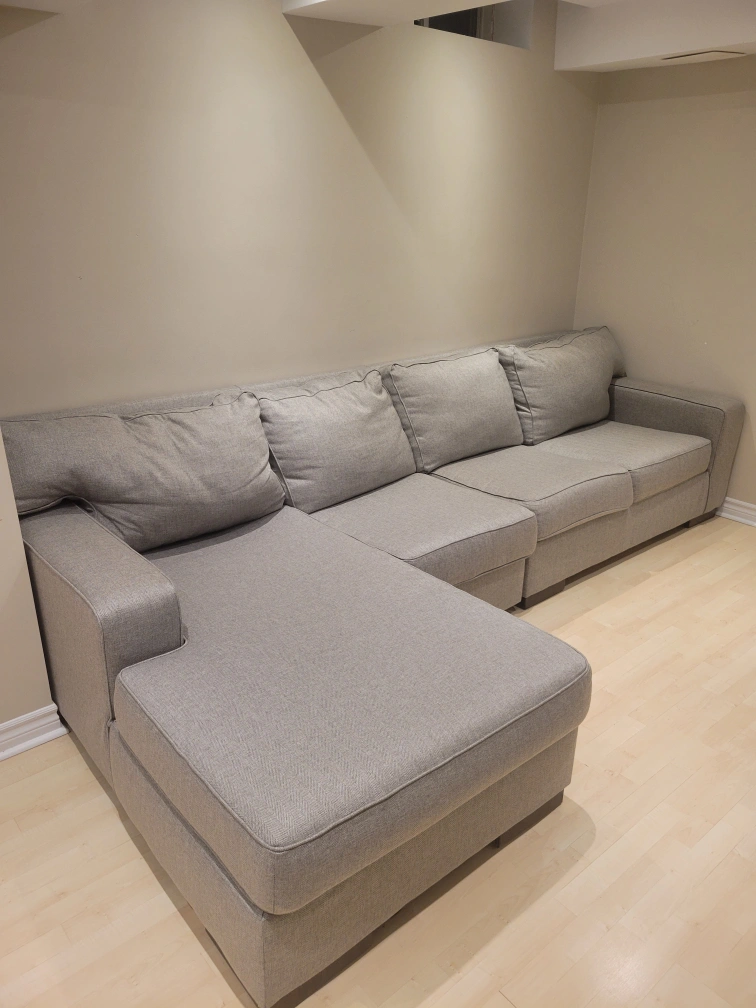Ashleys grey sectional sofa with Chaise a comfy light grey sectional sofa! It features a chaise lounge, perfect for relaxing after a long day. The sofa is in great condition and would be a great addition to any living room or basement family room.Excellent condition – no stains or tears. Perfect for lounging or hosting! Retail price $1699.99+