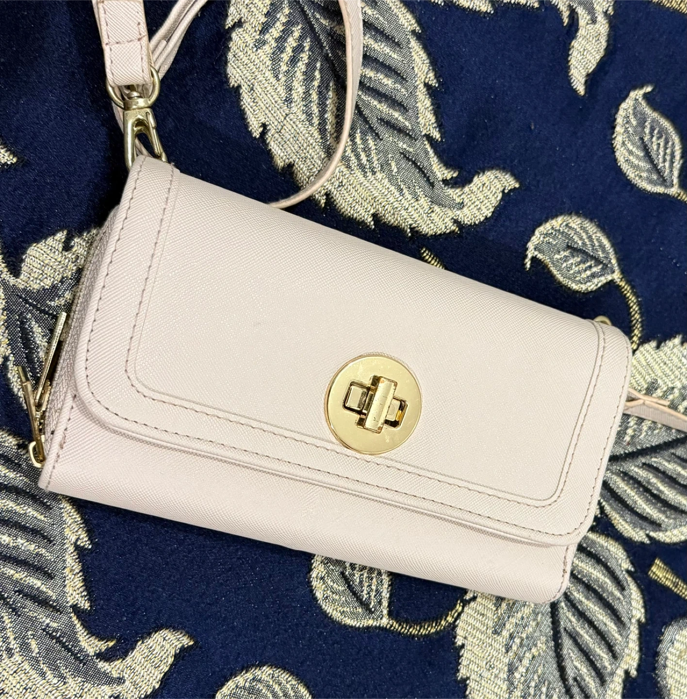 Selling a light pink crossbody wallet. It features a gold-tone twist lock closure and a detachable strap. It has multiple compartments for cards, cash, and a zippered pocket for coins. Perfect for keeping your essentials organized on the go!