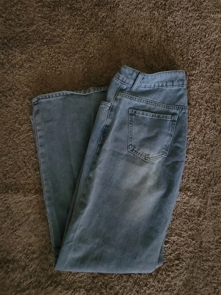 Selling a pair of light wash denim jeans! They're in good condition, perfect for a casual look. The material is denim, and they have a classic jean style with pockets.