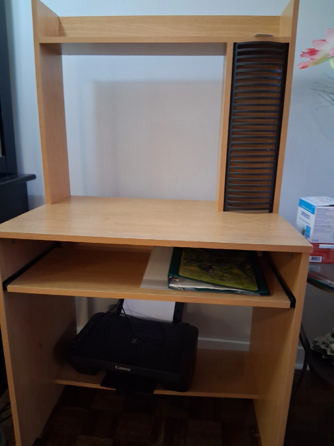 Selling a light wood computer desk that's in great shape! It comes with a hutch, providing extra storage space. Perfect for a home office or study area. There's also a pull-out keyboard tray and a lower shelf for a printer or other items. It's a sturdy and functional desk that will fit well in any room