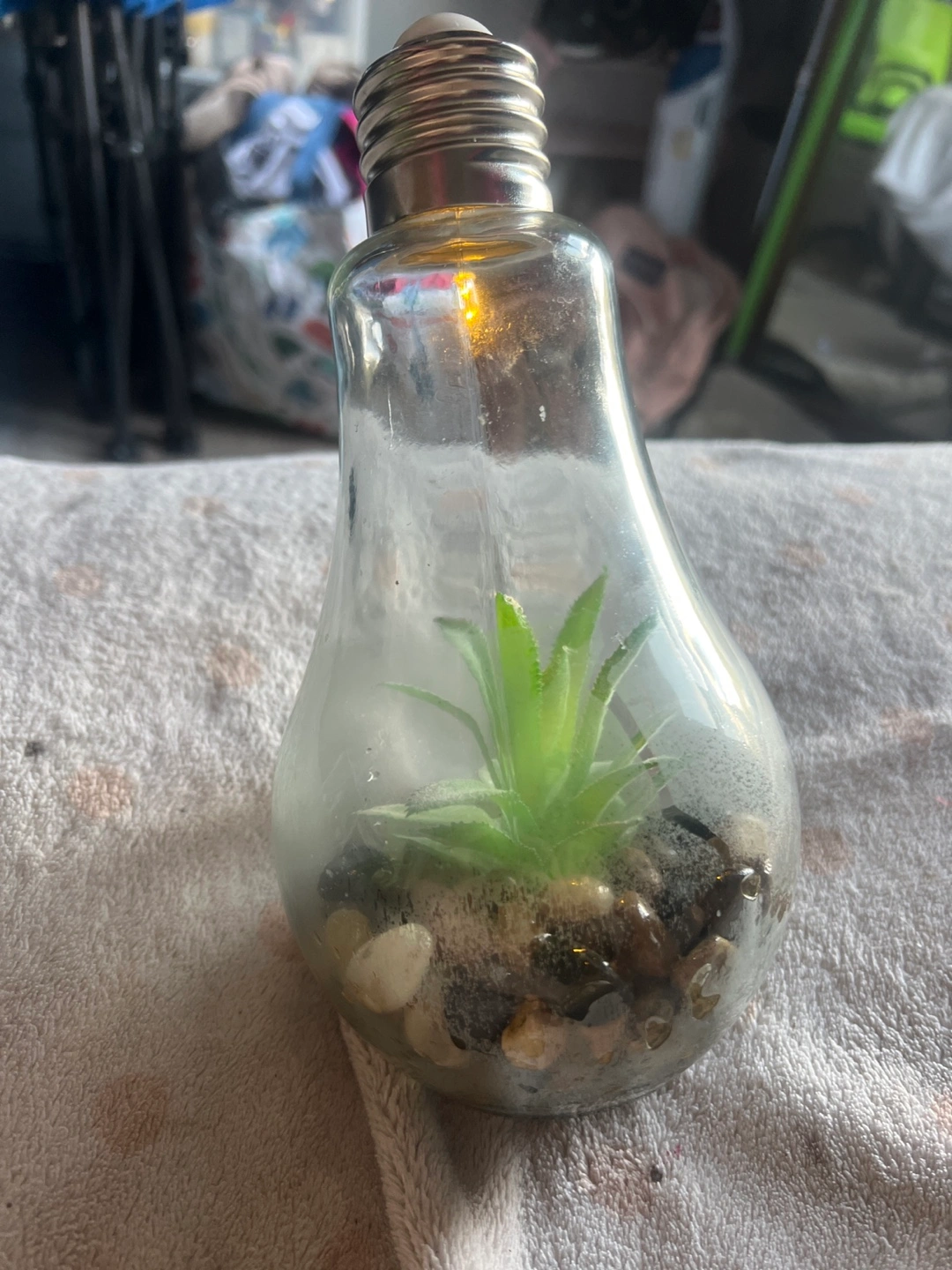 Glass lightbulb terrarium. Contains artificial succulent and decorative stones. Small, decorative accent piece.