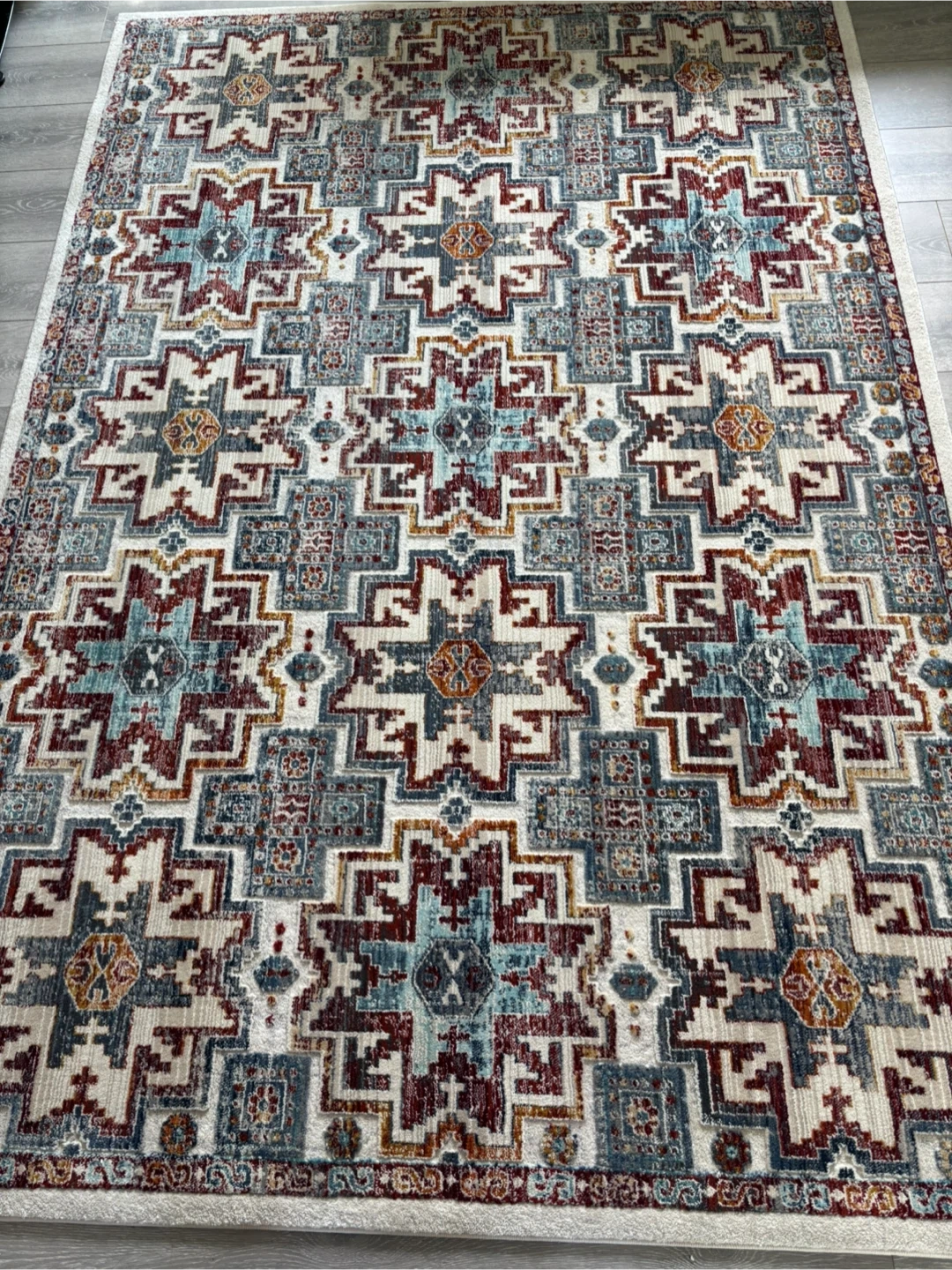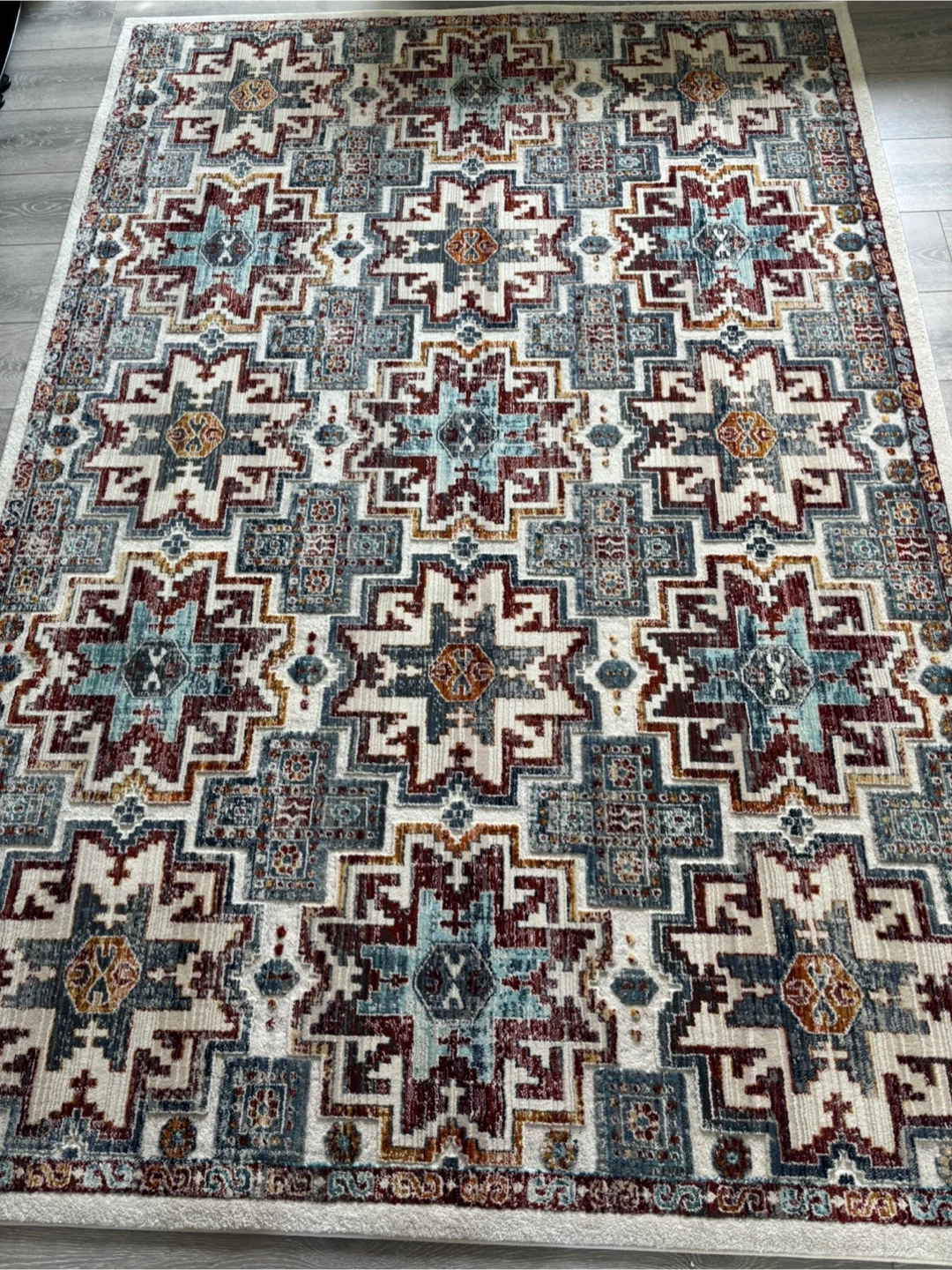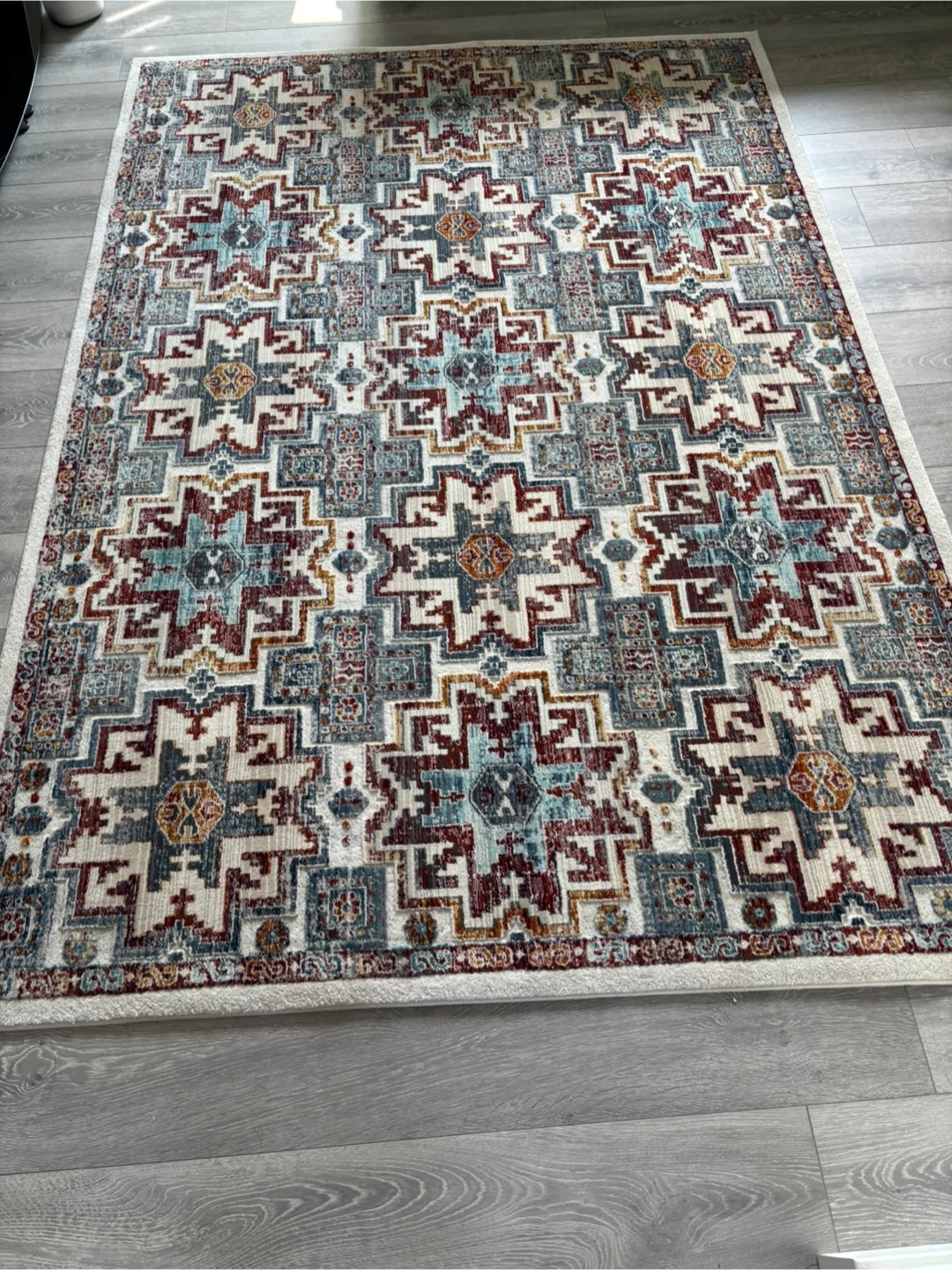 Selling a lightly used 5×7 ft area rug in excellent condition. Vibrant geometric pattern with shades of red, blue, and cream — perfect for living rooms, bedrooms, or offices. • Size: Approx. 5×7 ft • Condition: Lightly used, like new, no stains or damage • Style: Modern and eye-catching design