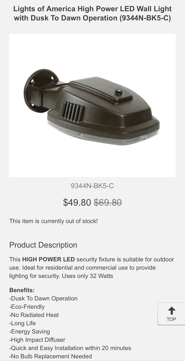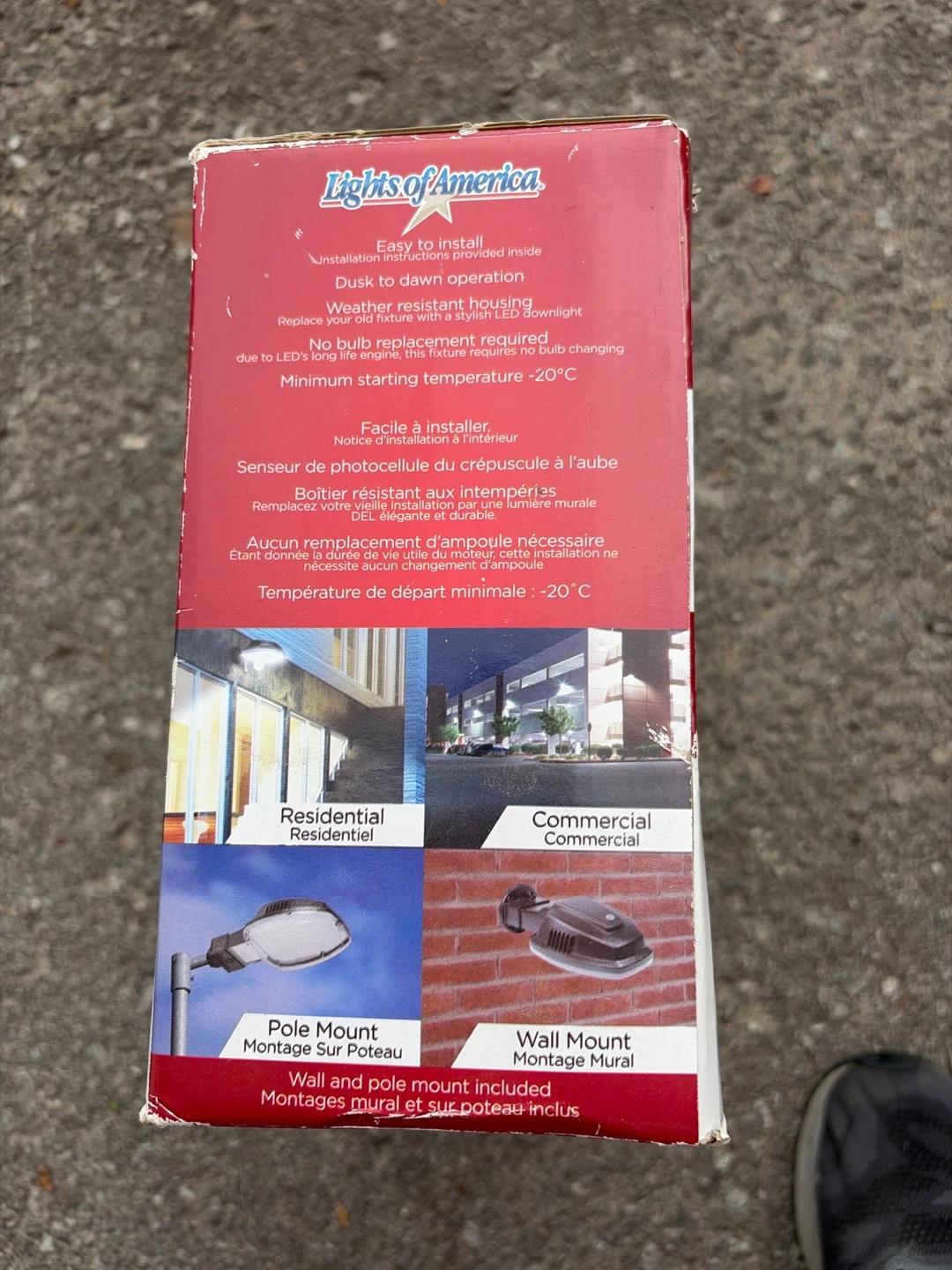 Lights of America High Power LED Wall Light with Dusk To Dawn Operation. It's ideal for residential and commercial use to provide lighting for security. Uses only 32 Watts. Can be wall or pole-mounted. Benefits: -Dusk To Dawn Operation -Eco-Friendly -No Radiated Heat -Long Life -Energy Saving -High Impact Diffuser -Quick and Easy Installation within 20 minutes -No Bulb Replacement Needed