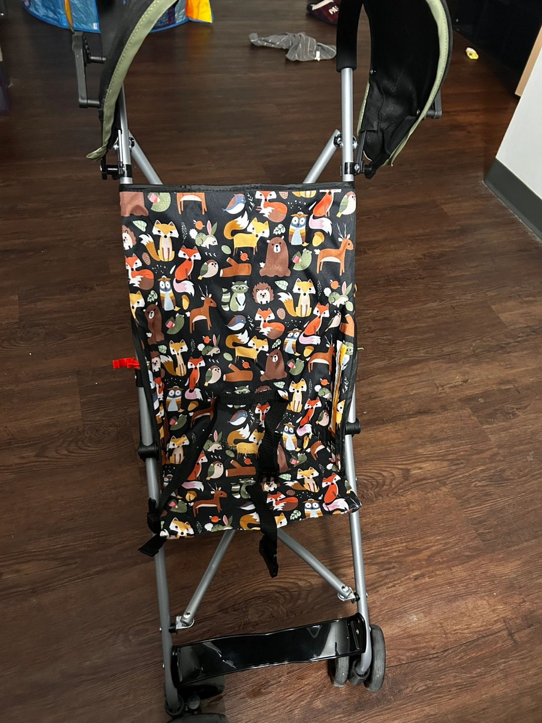 Compact foldable stroller. Features a cute forest animal print. Suitable for toddlers and young children. Includes safety harness and adjustable canopy. It’s only been used 2-3 times, so basically brand new still. Works fine, my kids just to big for it.