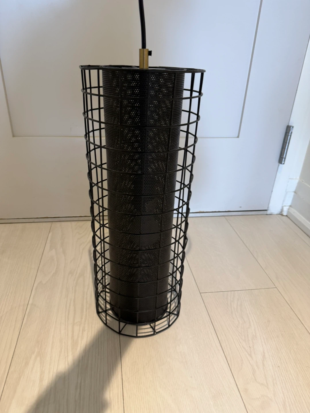 Black metal cage pendant light in good condition—stylish and ready to brighten up any room.