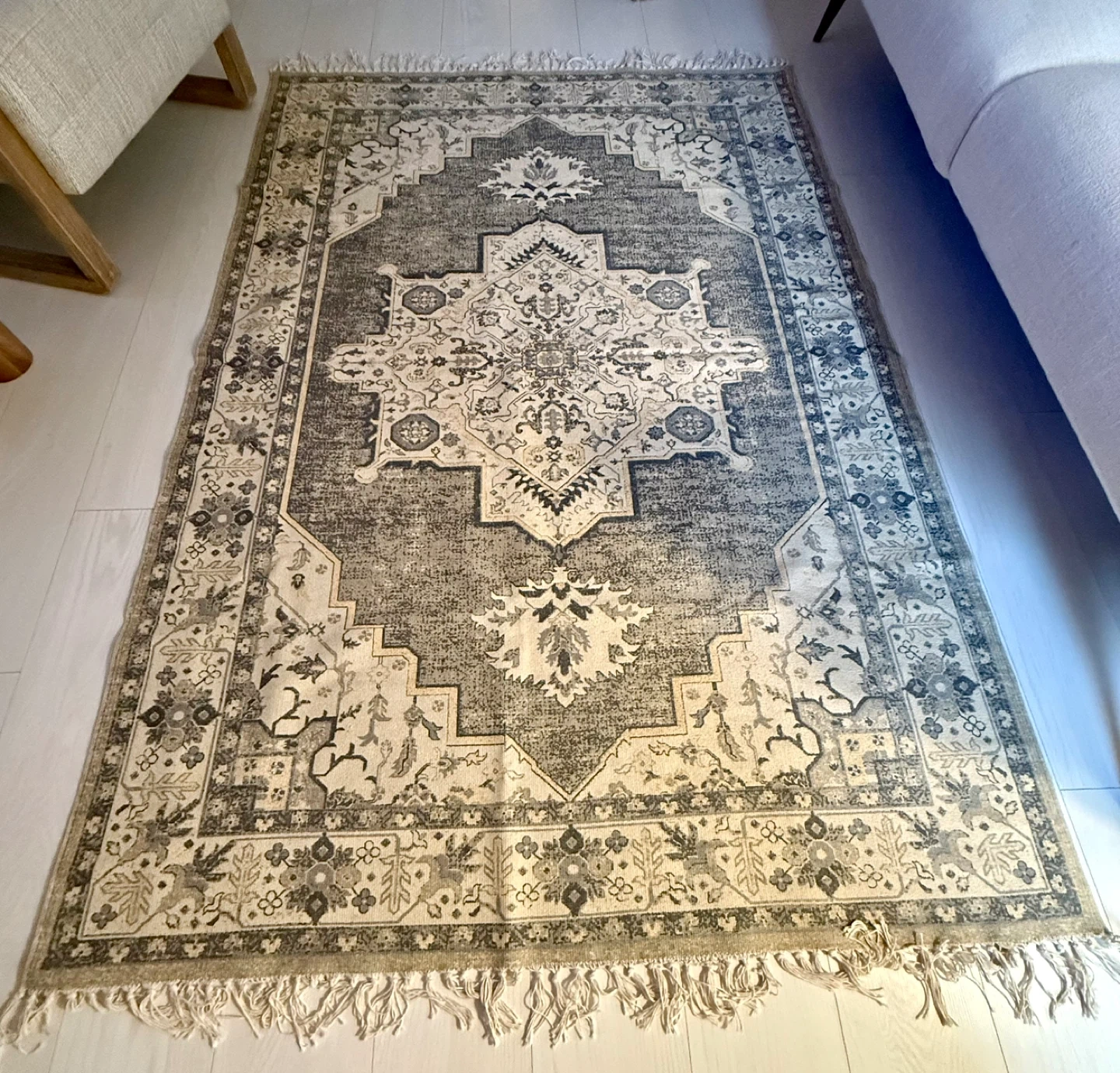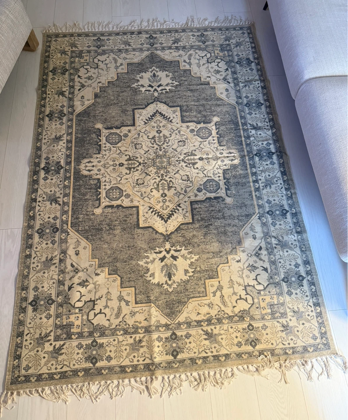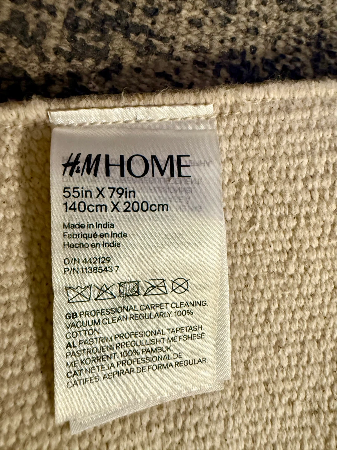 Selling a beautiful H&M HOME area rug with a detailed pattern. It’s in excellent condition and adds a stylish touch to any room. The neutral tones make it easy to pair with any décor. Material: 100% cotton Measurements: 55in x 79in / 140cm x 200cm Details: • Professional carpet cleaning • Vacuum regularly • Washing forbidden • Do not bleach • Dry flat • Do not iron • Do not dry clean