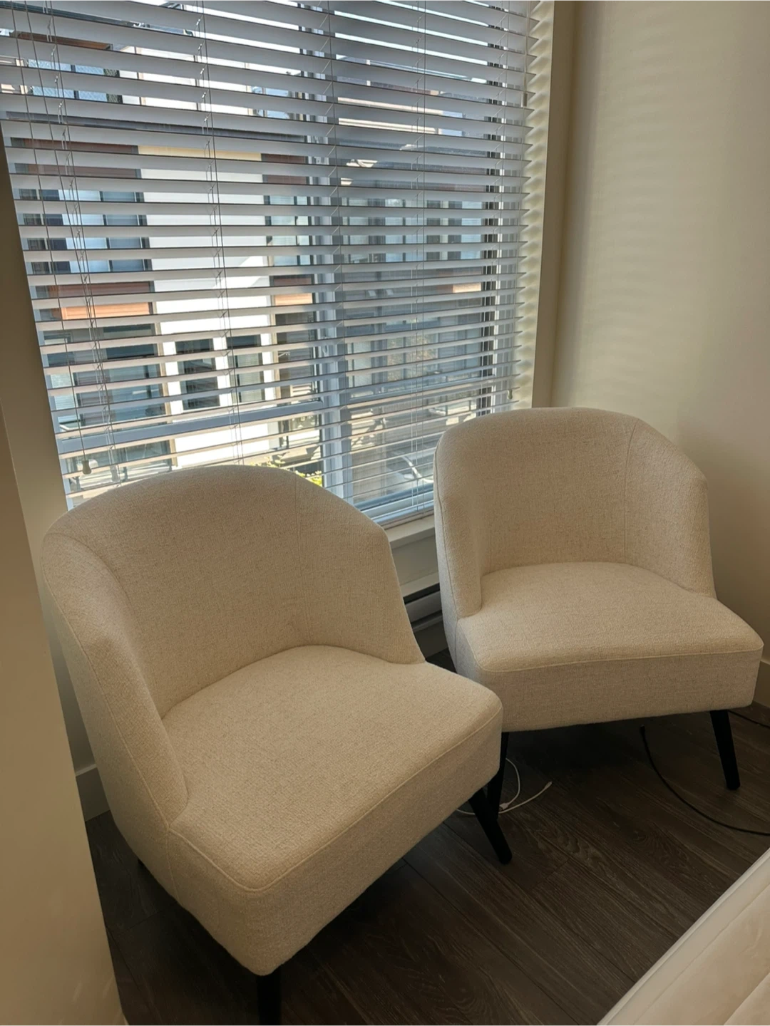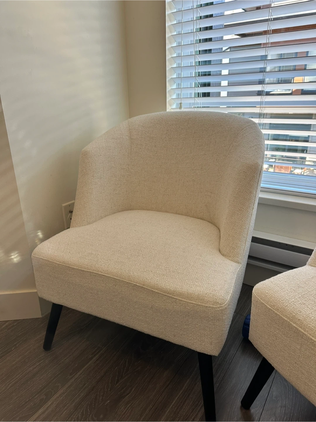 Selling a set of two accent chairs in a lovely beige colour! They're in great condition and would be a perfect addition to any living space or bedroom. The chairs feature a modern design with a curved back and sleek black wooden legs. Almost New, barely used. Moving sale Price for 2 One for $170