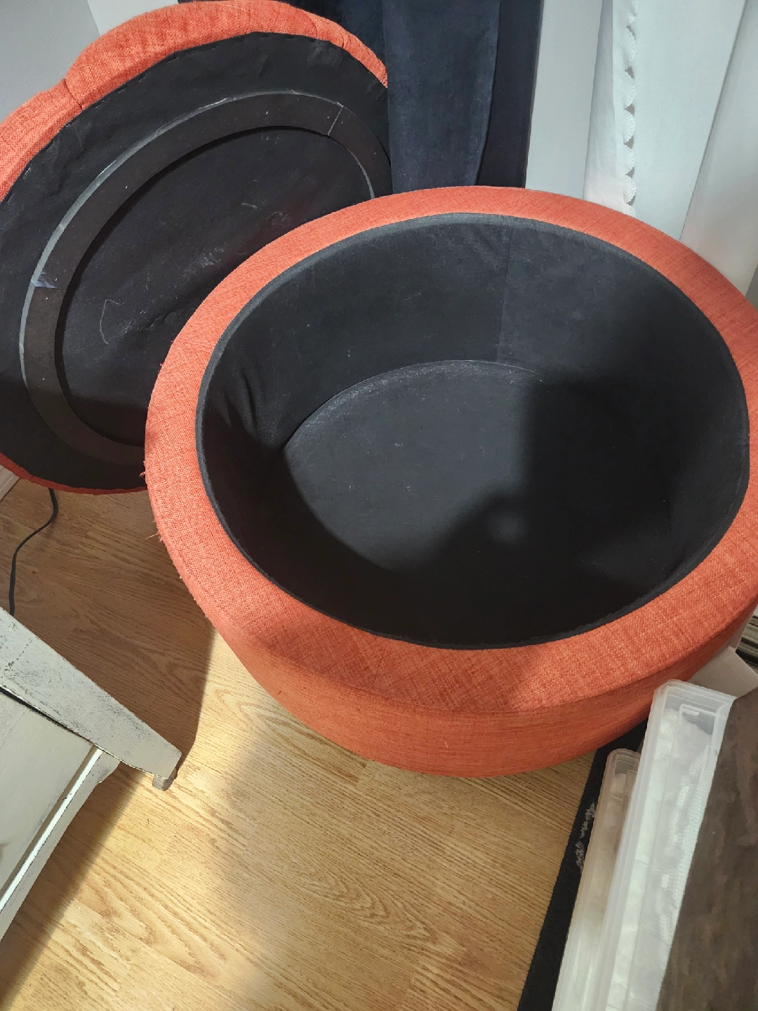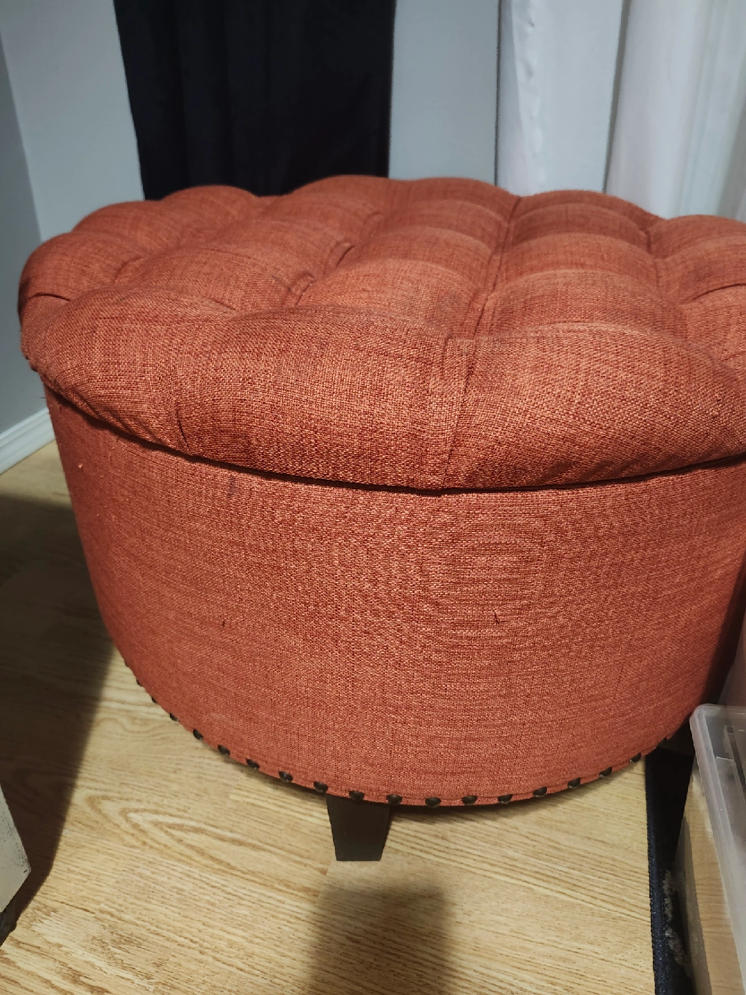 Selling a gorgeous round storage ottoman. It's a nice burnt orange in color with stud trim along bottom. The top lifts off with convenient storage inside. perfect for adding a pop of color and extra functionality to any room with extra seating and storage! 25" round Tuffelled top Very good quality PRICE IS FIRM