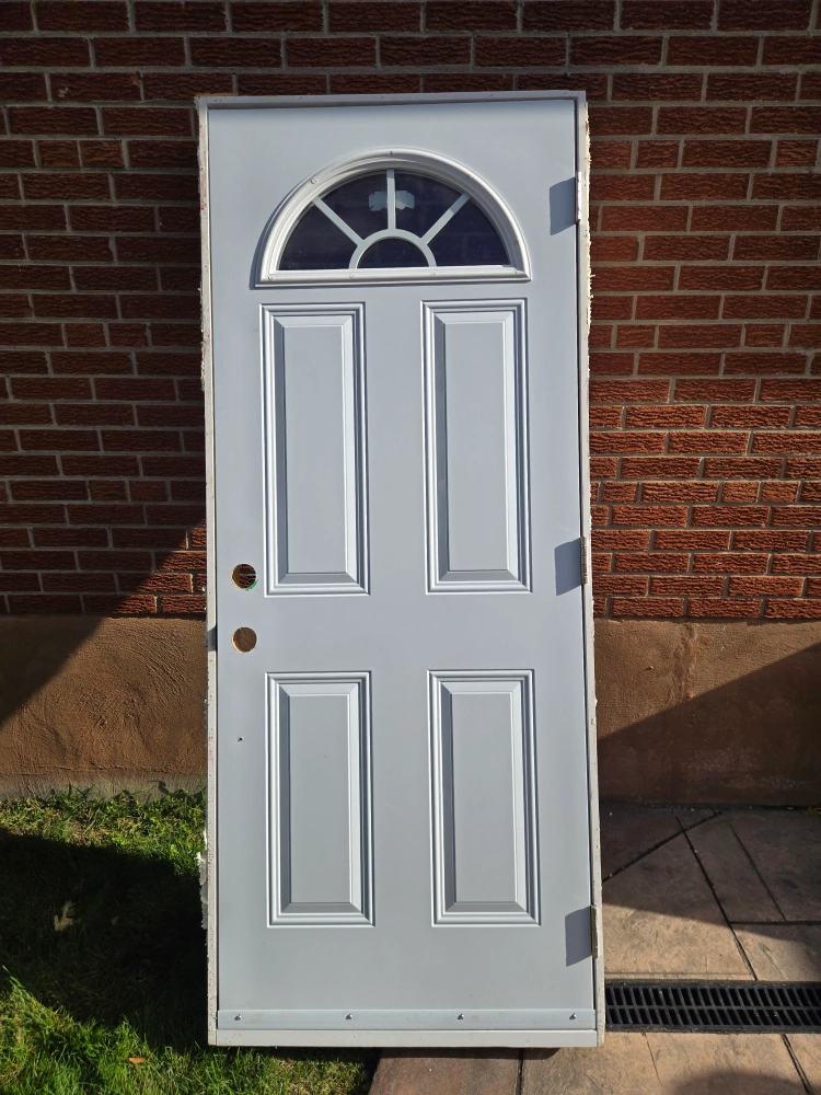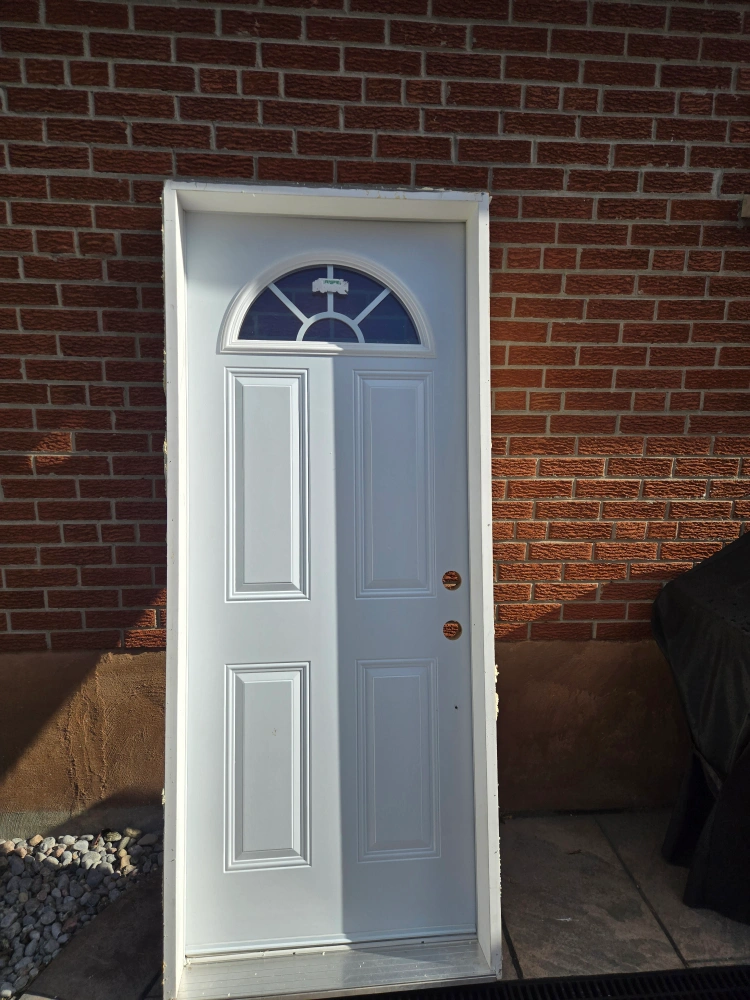 Selling a white exterior door. It has a window at the top with a decorative frame. Great for a front or back entrance! It's 80x 32 like new!!!! Was installed. Opens inwards!!!!! Wife didn't like the style. Paid over 800$ for it. Was bought at Canadian lumber on dupont. Small hole in door for lock set, which was taken out. 200$ firm!!! Amazing deal. Pickup only mississauga