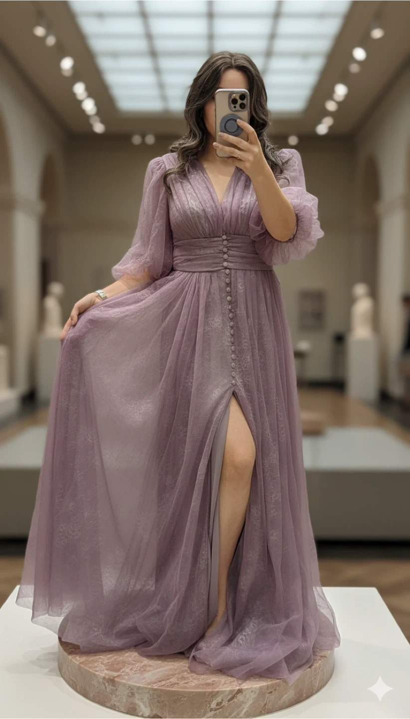 Selling a beautiful lilac chiffon maxi dress. It features a V-neck, long sleeves, and a front slit. Perfect for a special occasion! Size medium