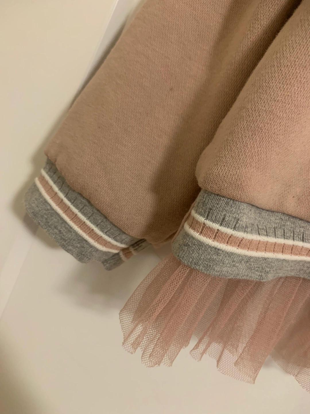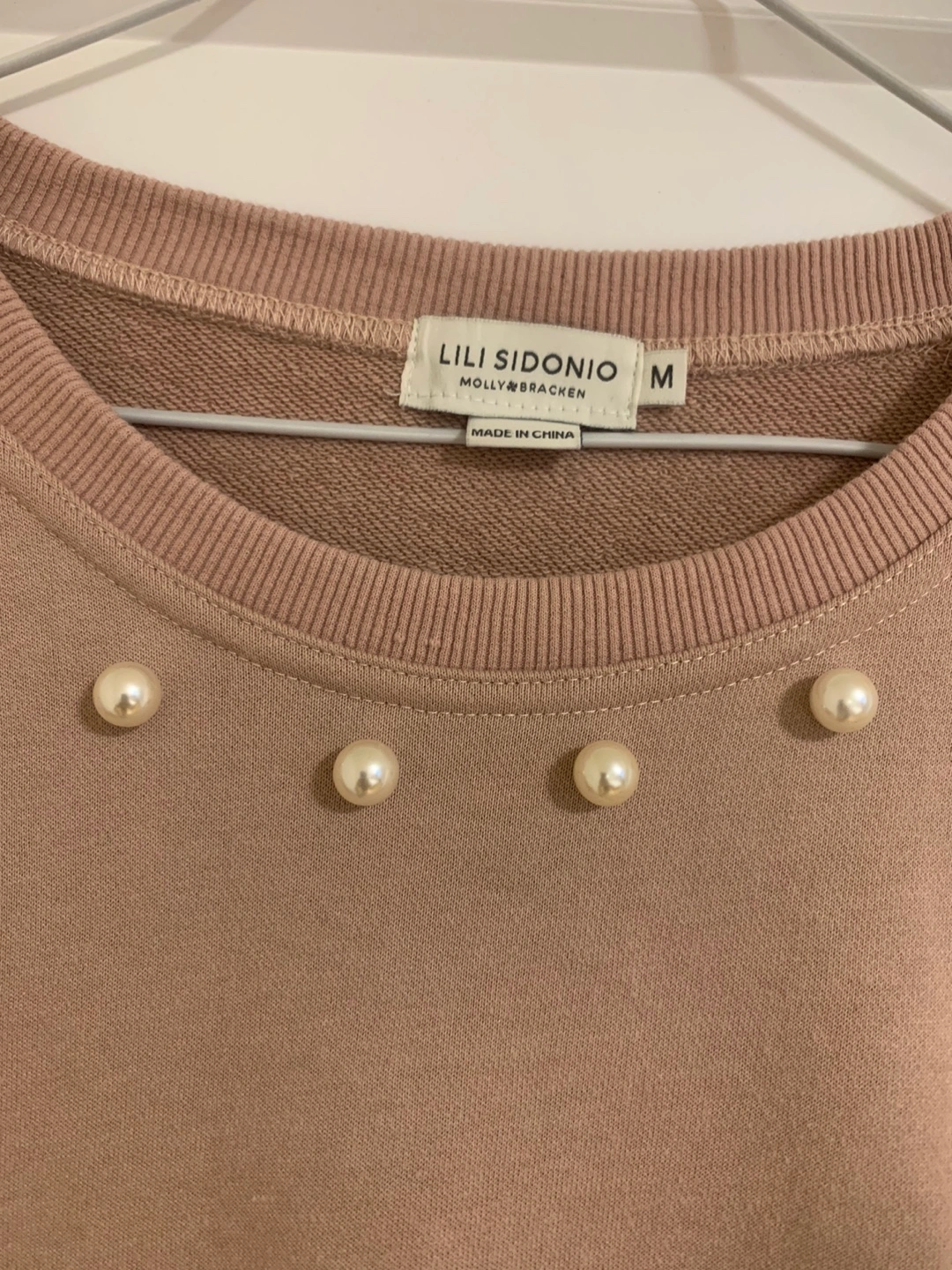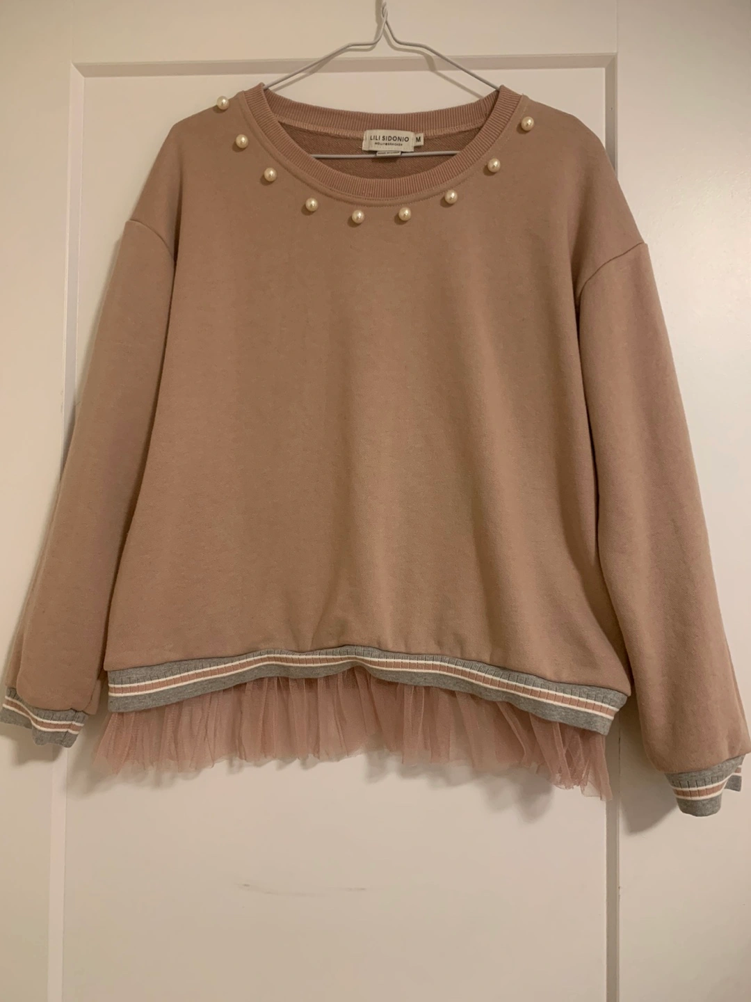 Rose sweatshirt. Size M. Features pearl embellishments at neckline and tulle trim at hem. Grey and white striped detailing at cuffs and hem.