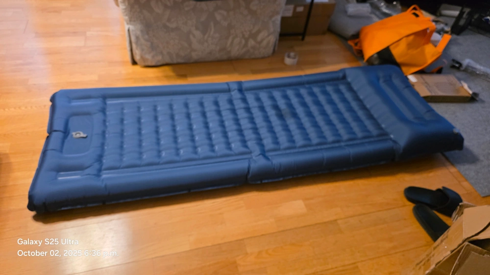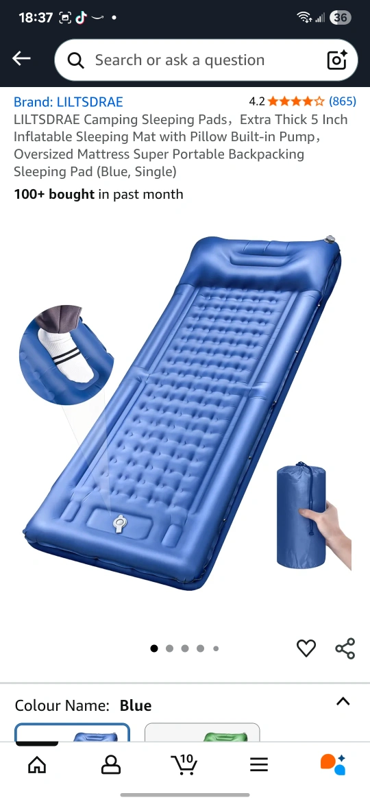 Selling a LILTSDRAE camping sleeping pad in blue. It's extra thick and 5 inches, making it a super portable backpacking sleeping pad. It also has a built-in pump! Feel the warmth and comfort of home when you're out camping