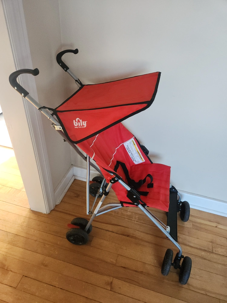 Selling a red Lily Baby Love Stroll stroller. It's lightweight and folds up for easy storage and transport. Perfect for taking your little one on walks! Some light stains as shown in photo. Folds up like an umbrella. Perfect for airplane rides. All locks and mechanics work.