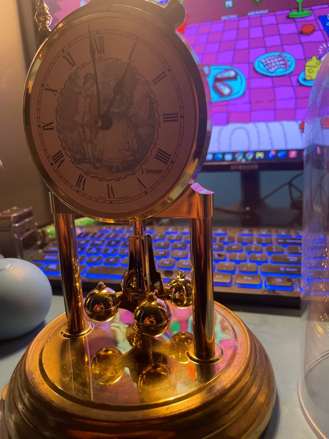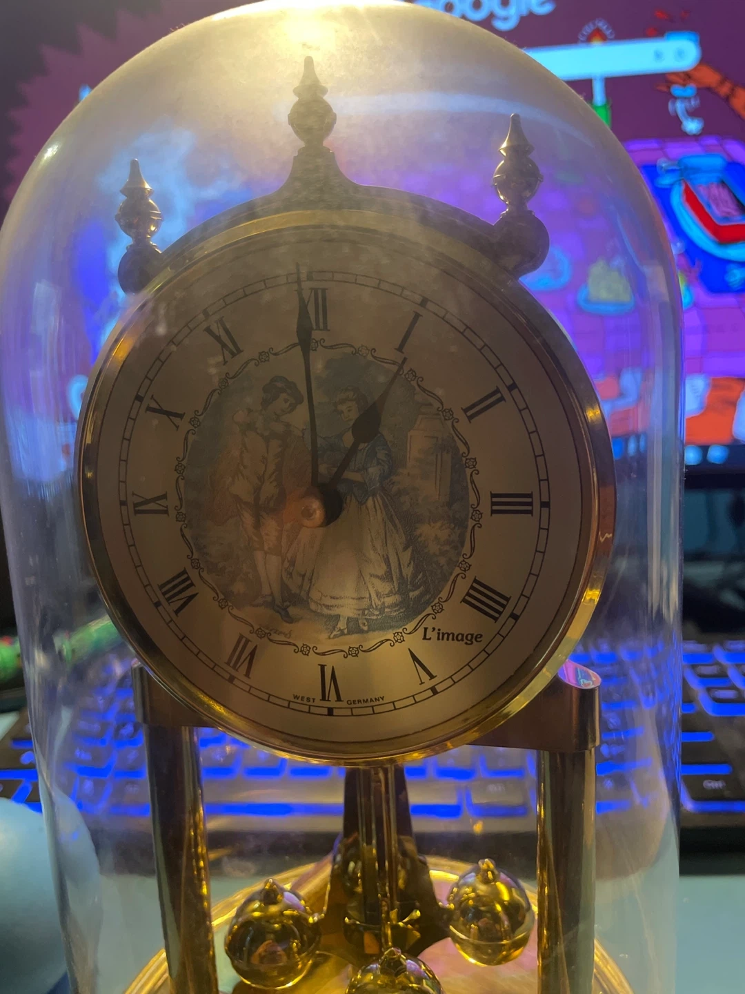 Selling a beautiful L'image dome clock made in West Germany. It features a classic design with a glass dome and a pendulum with decorative balls. The clock face has Roman numerals and a charming illustration. It would make a lovely addition to any home! Powered by single double a battery(included)