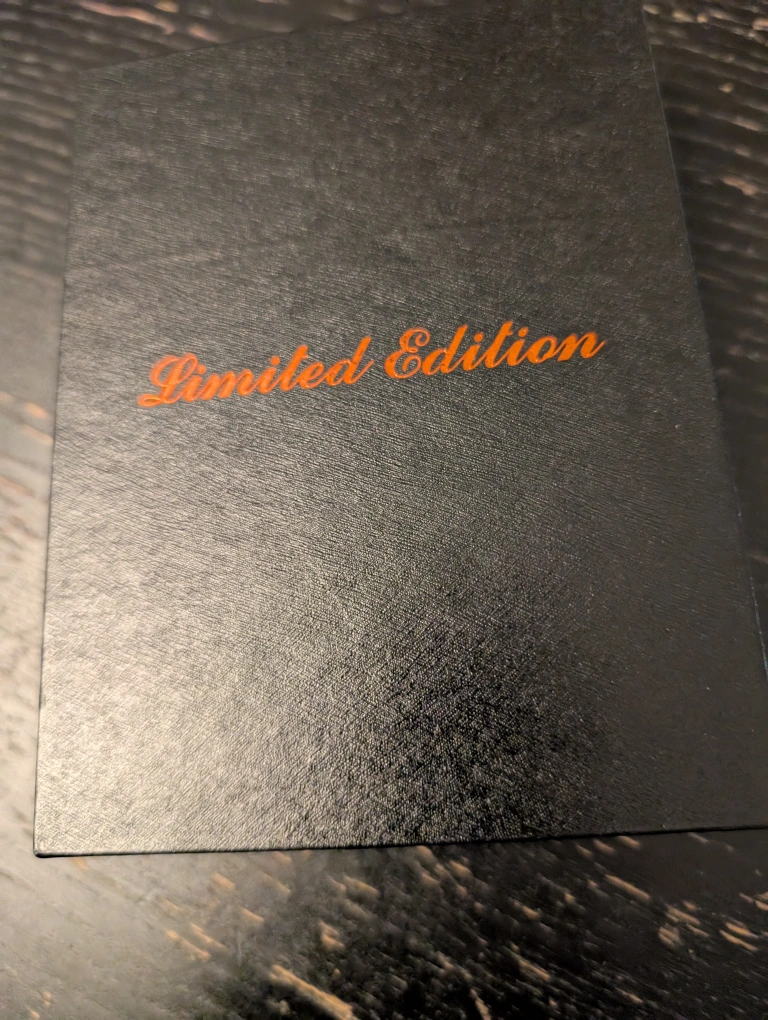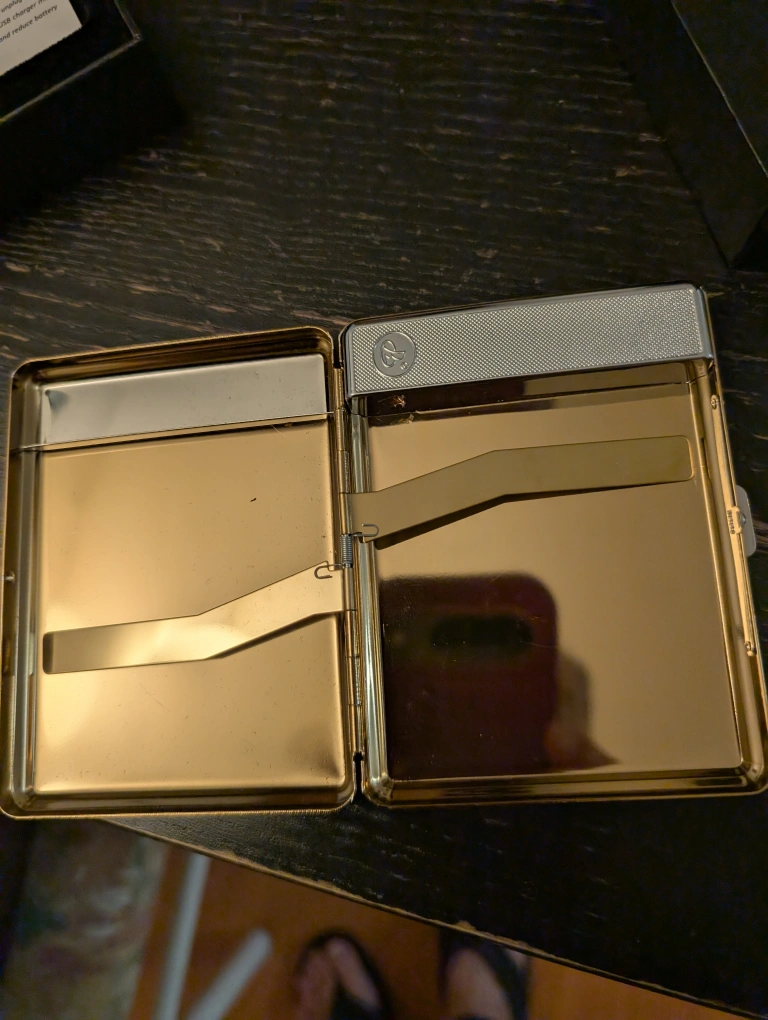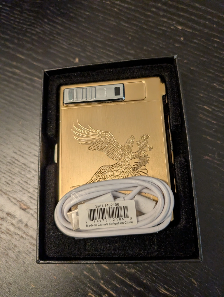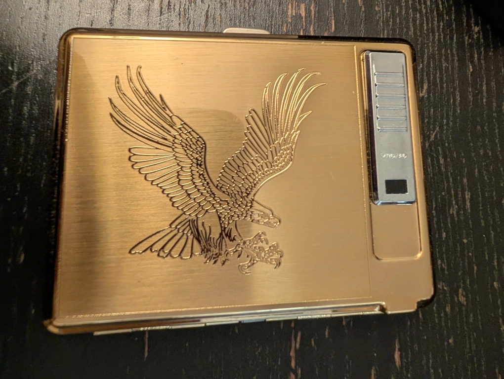 Selling a limited edition gold cigarette case. It features an eagle design on the front. It comes with its original box and a charging cable