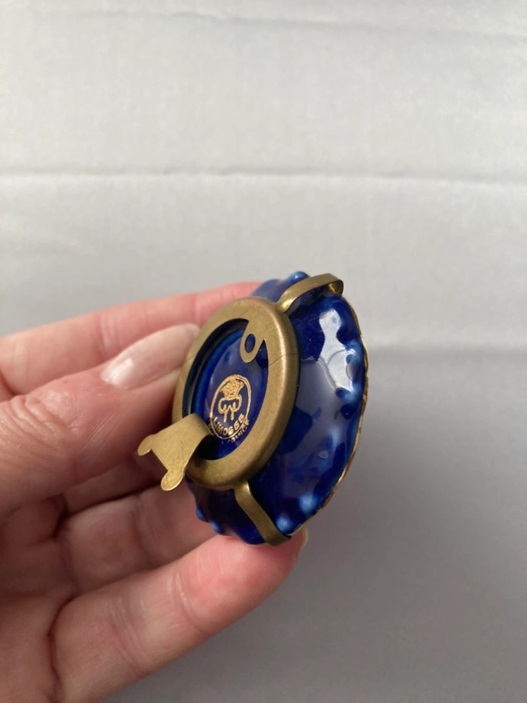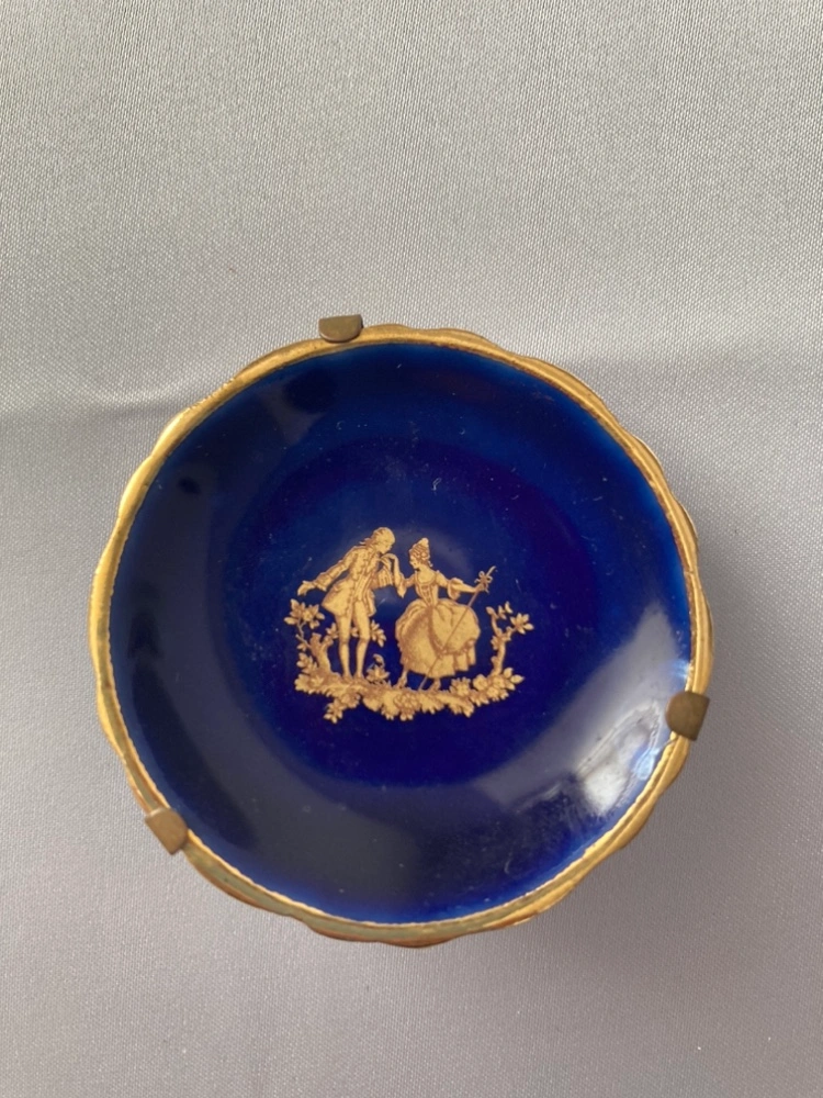 This is a beautiful Mini Limoges France Dish. It is a dark blue with gold trim and a gold design in the centre. It features a metal frame on the back which allows it sit upright on a flat surface or hooked onto the wall. It is in great condition About 2” diameter