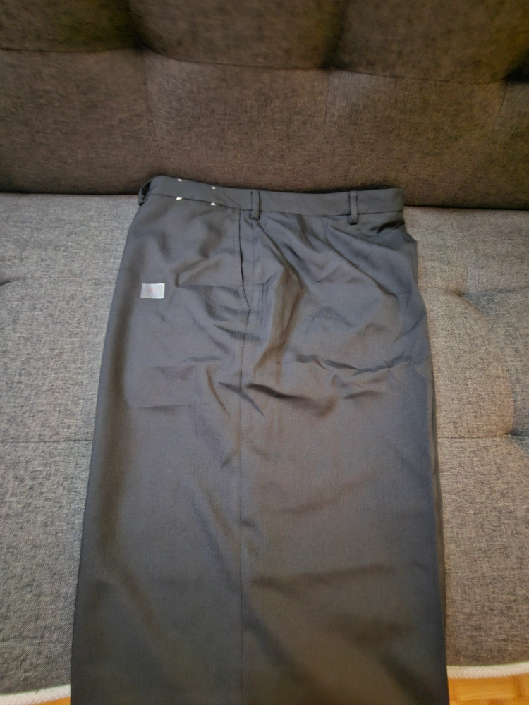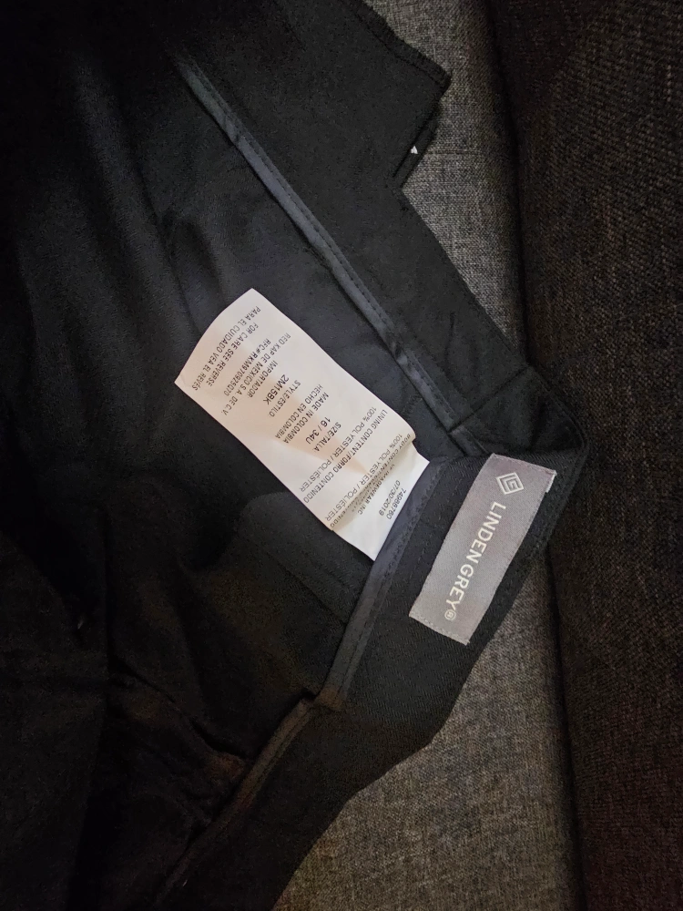 Selling a pair of Linden Grey trousers in size 16/34U. The material is 100% polyester. Only cash.