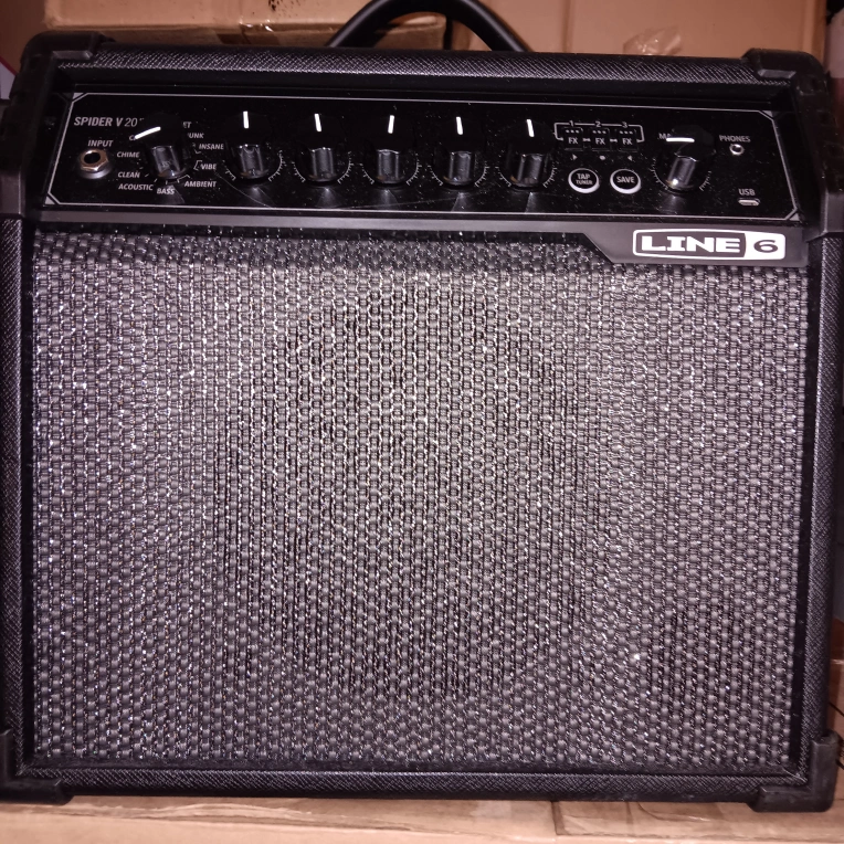 Selling a Line 6 Spider V 20 guitar amplifier. It features settings for Chime, Clean, Acoustic, and Bass, as well as effects like Unk, Insane, and Ambient. It also has a USB port.