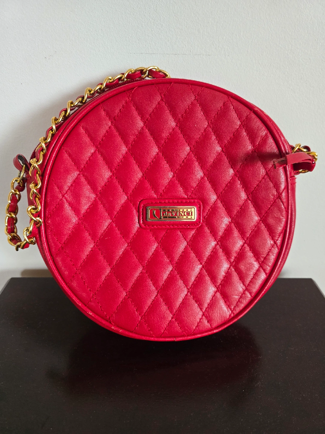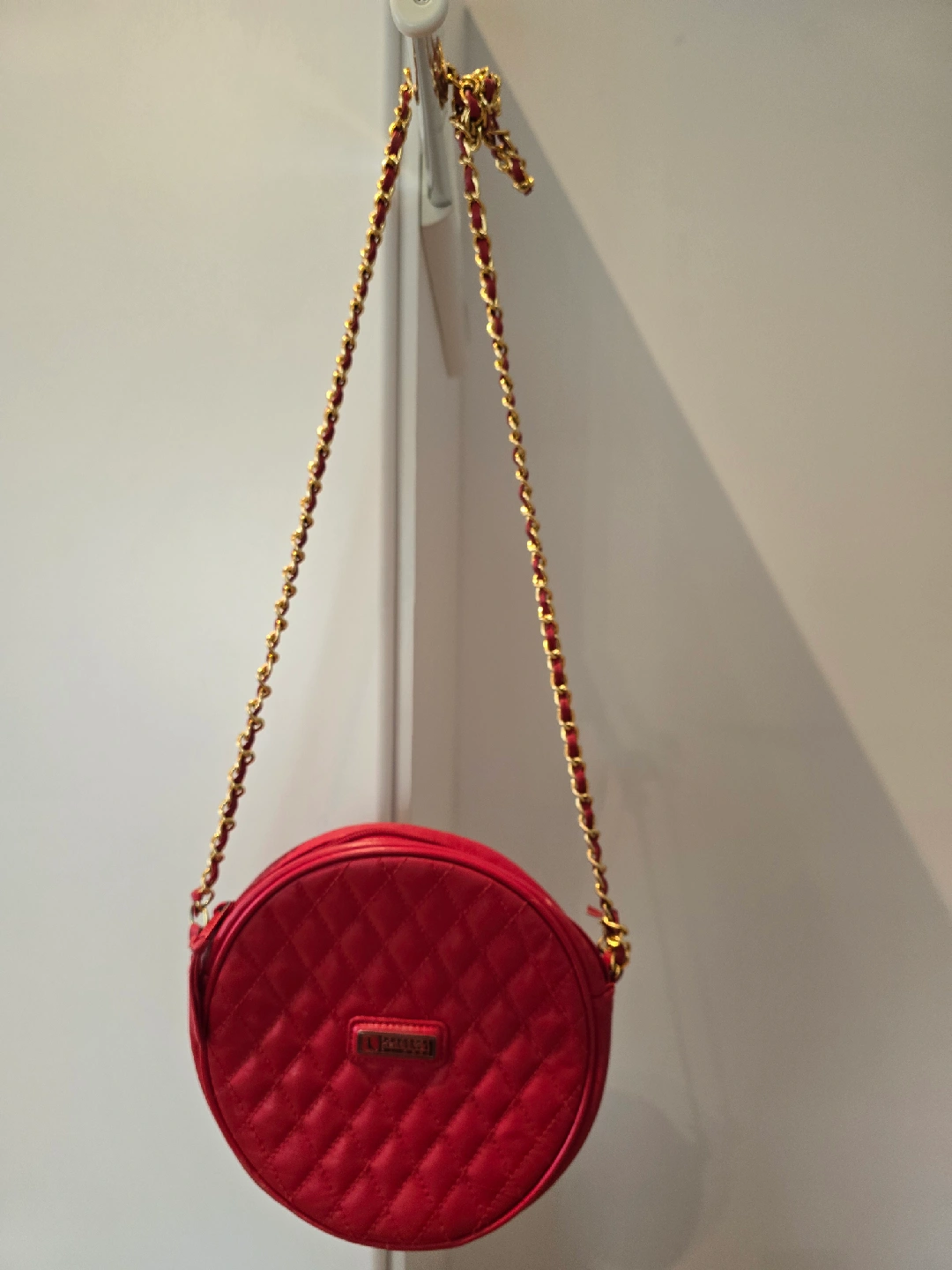 Selling a cute red quilted round crossbody bag from Lino Perros! It features a gold chain strap and a quilted design. Perfect for adding a pop of colour to any outfit and easy to carry around
